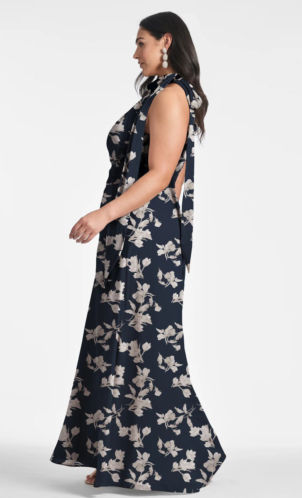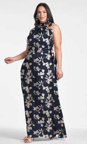 Vestido largo de gasa con print, cuello halter, detalle de listón en hombro, ajustado a la cintura, falda en corte A con movimiento y cierre invisible.