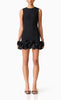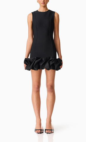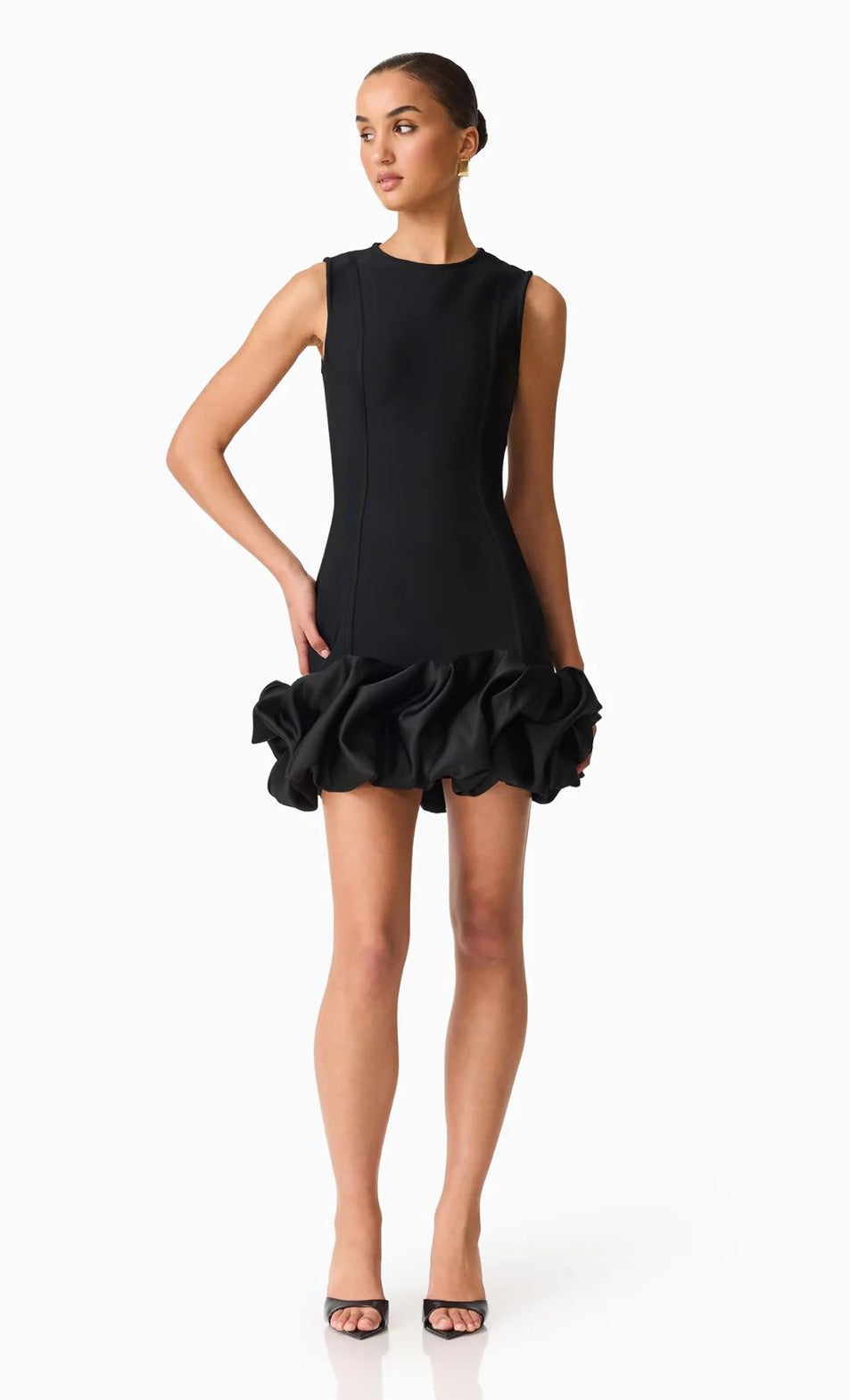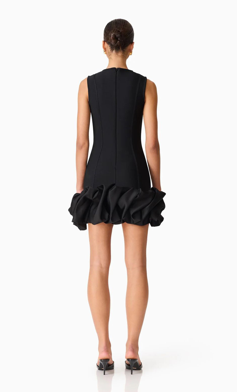 Vestido mini de tela stretch, cuello redondo, corte al cuerpo, detalle de satín abullonado en falda y cierre invisible.