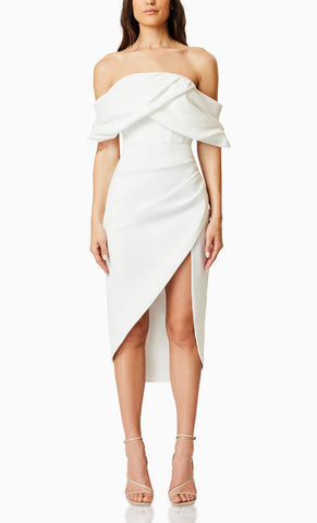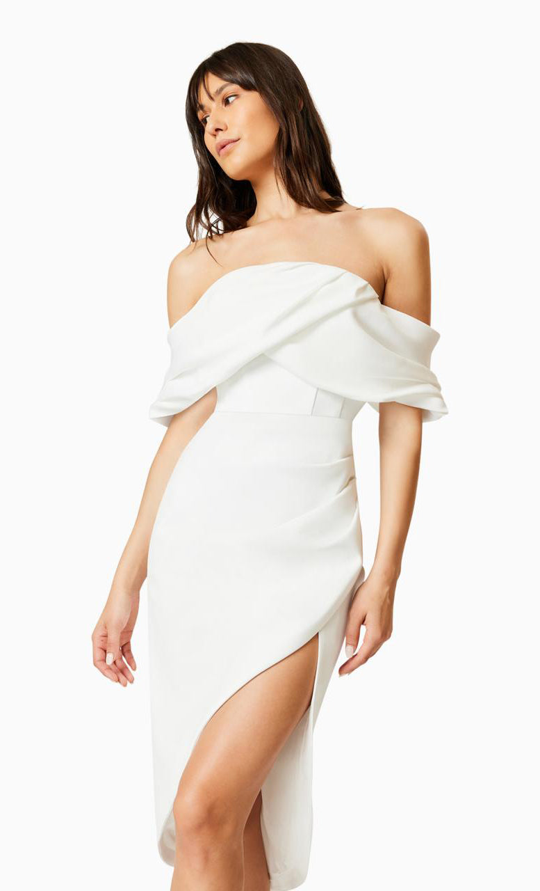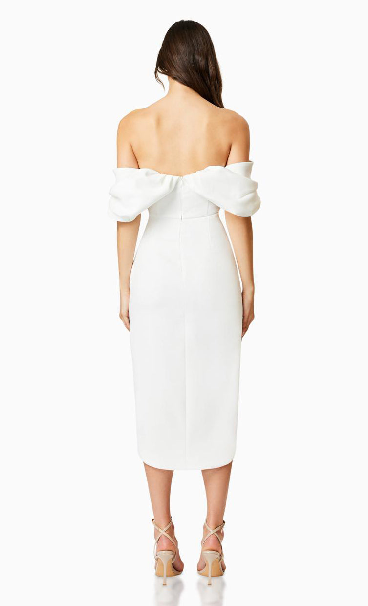 Vestido midi de stretch crepe, manga abullonada off the shoulder, detalle de pliegues en cintura, abertura al frente y cierre invisible.