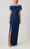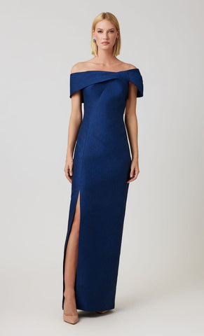 Vestido largo brocado con detalles metálicos, manga off the shoulder, detalle de moño en espalda, abertura al frente, corte al cuerpo y cierre invisible.