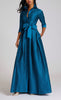 Vestido largo de tafeta tipo camisero, completamente bordado, manga 3/4, botones al frente, cinturón ajustable y falda en corte A con movimiento.