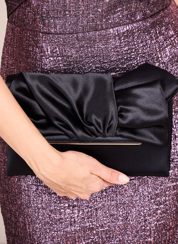 Clutch de tela satinada con detalle de moño al frente, cierre con imán y cadena dorada.