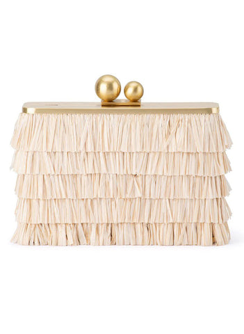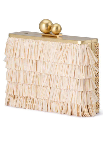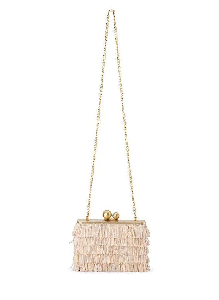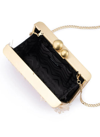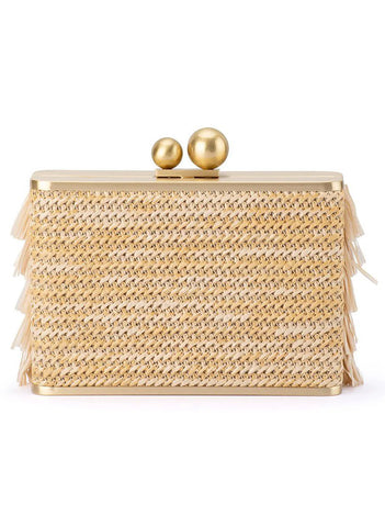 Clutch de rafia, marco dorado, cierre de click y cadena.