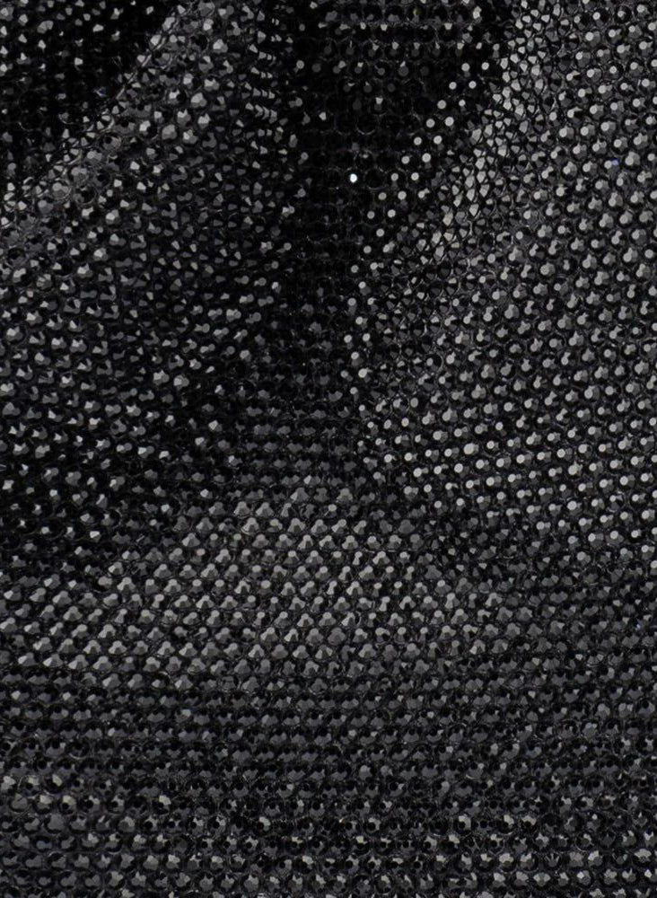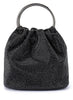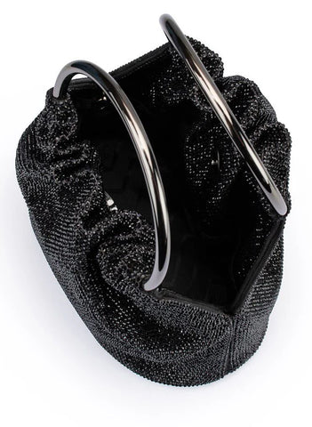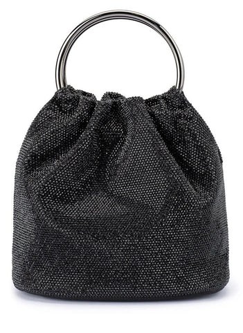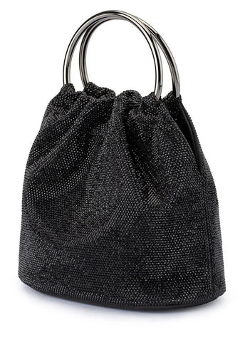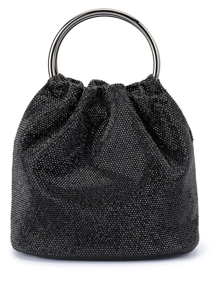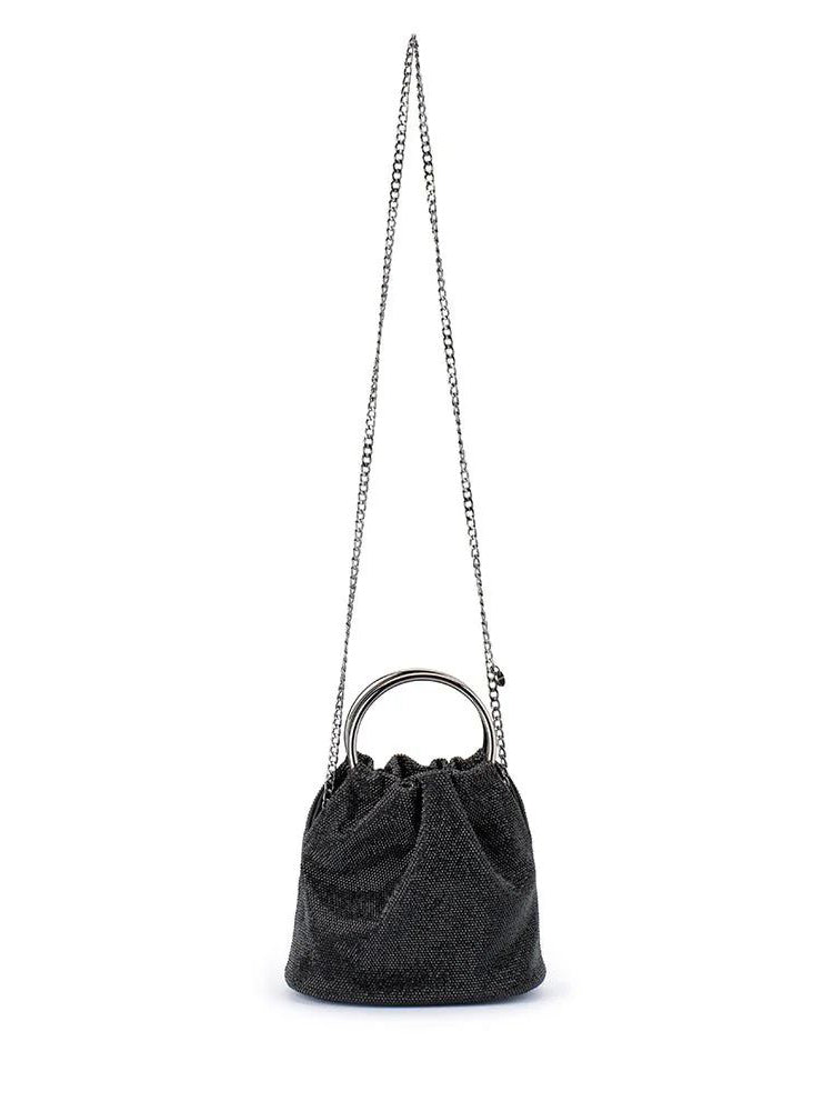 Clutch tipo bucket bag con detalle de cristales, asa de metal y cadena.