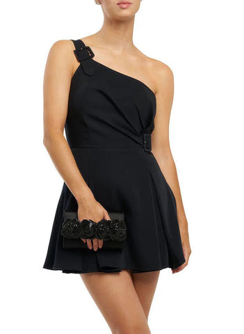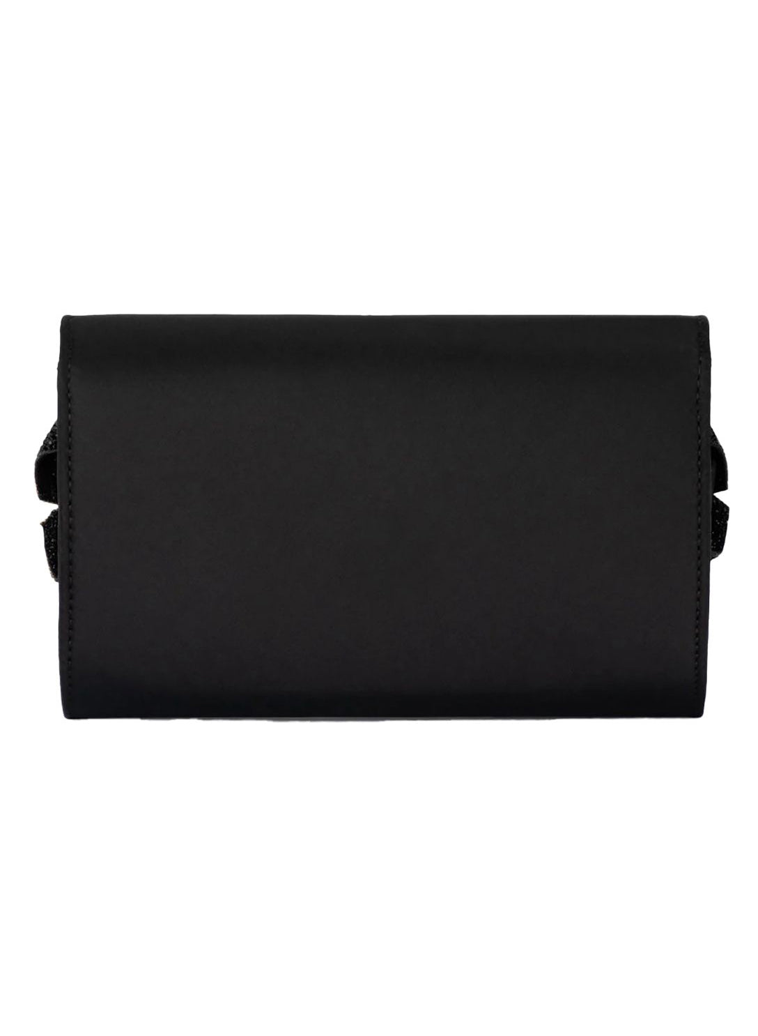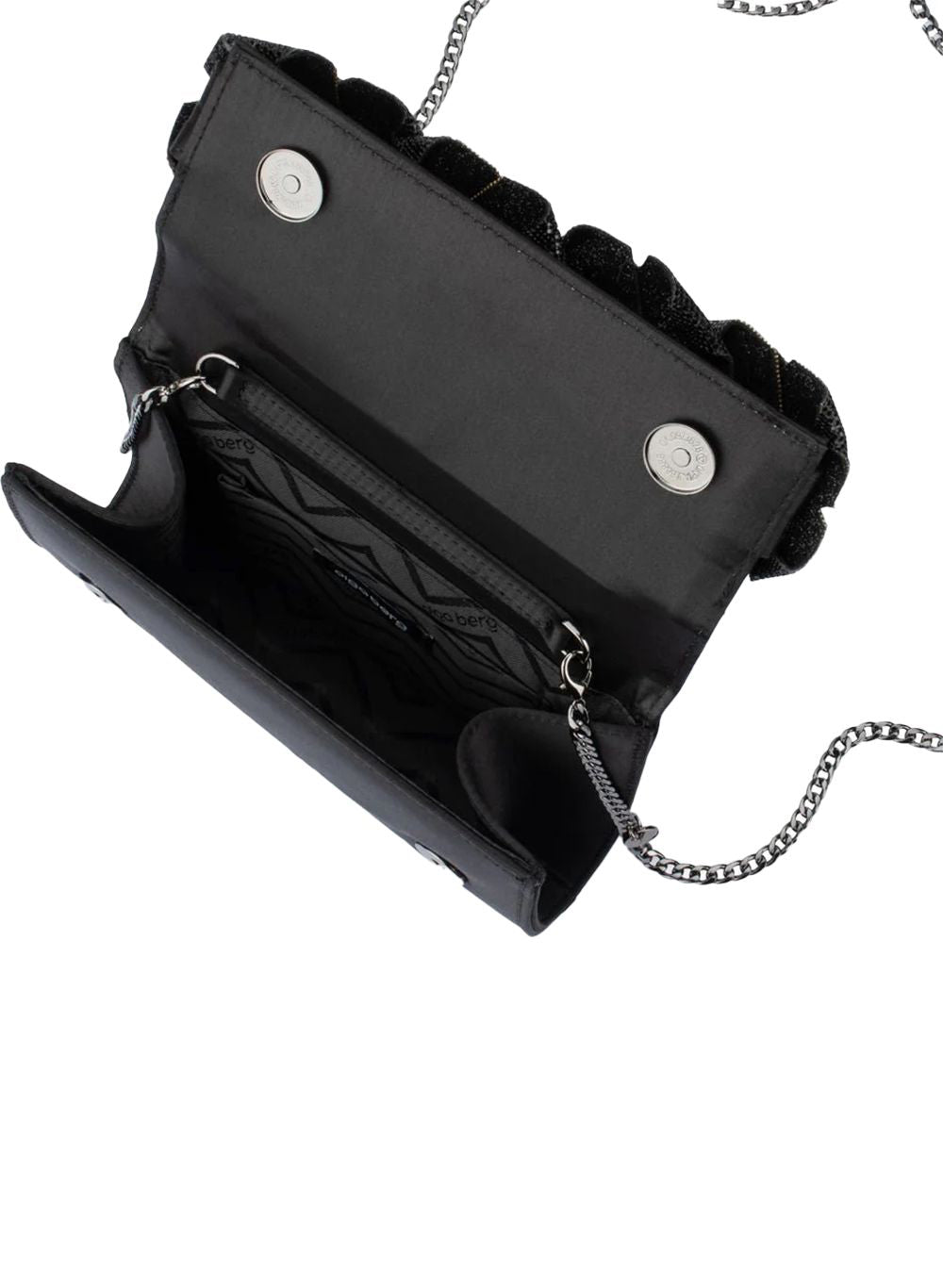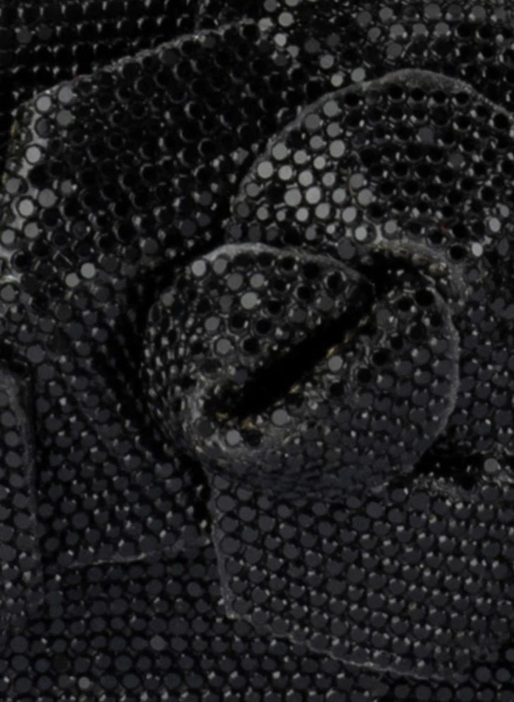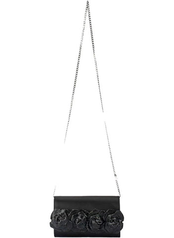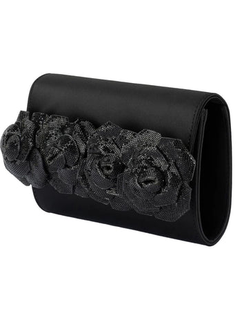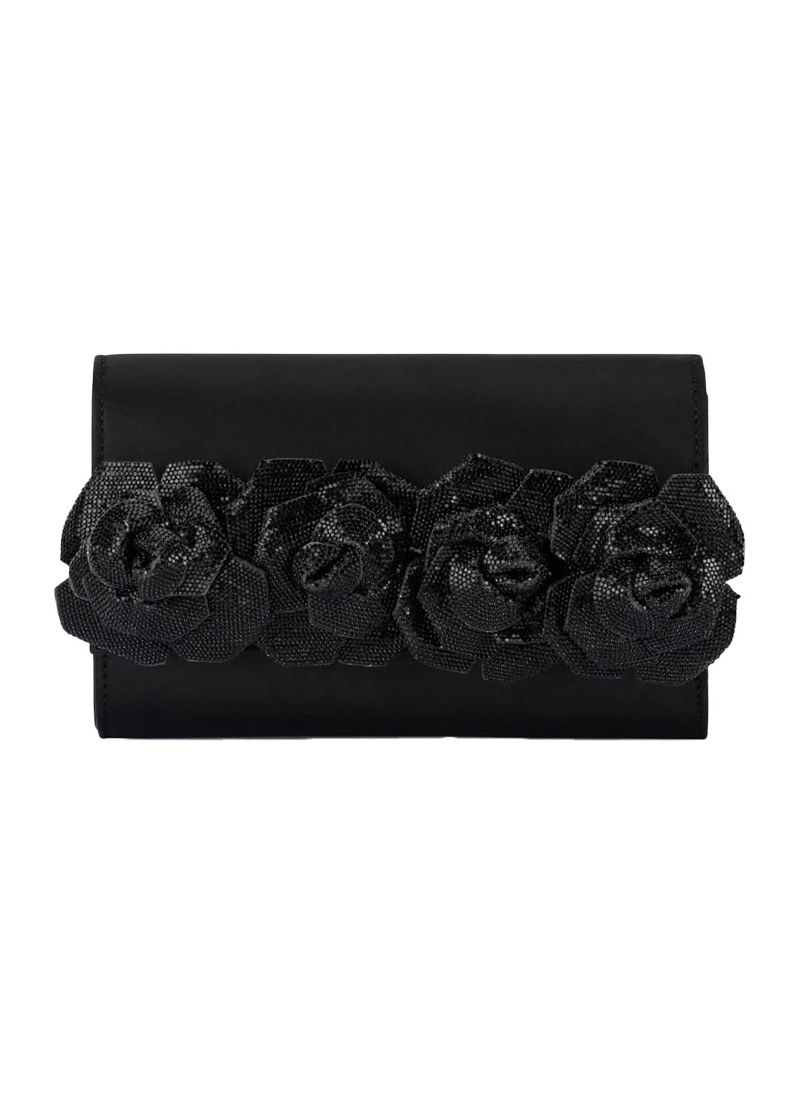 Clutch de satín, cierre con imán, detalle de flores en 3D con cristales y cadena plateada.