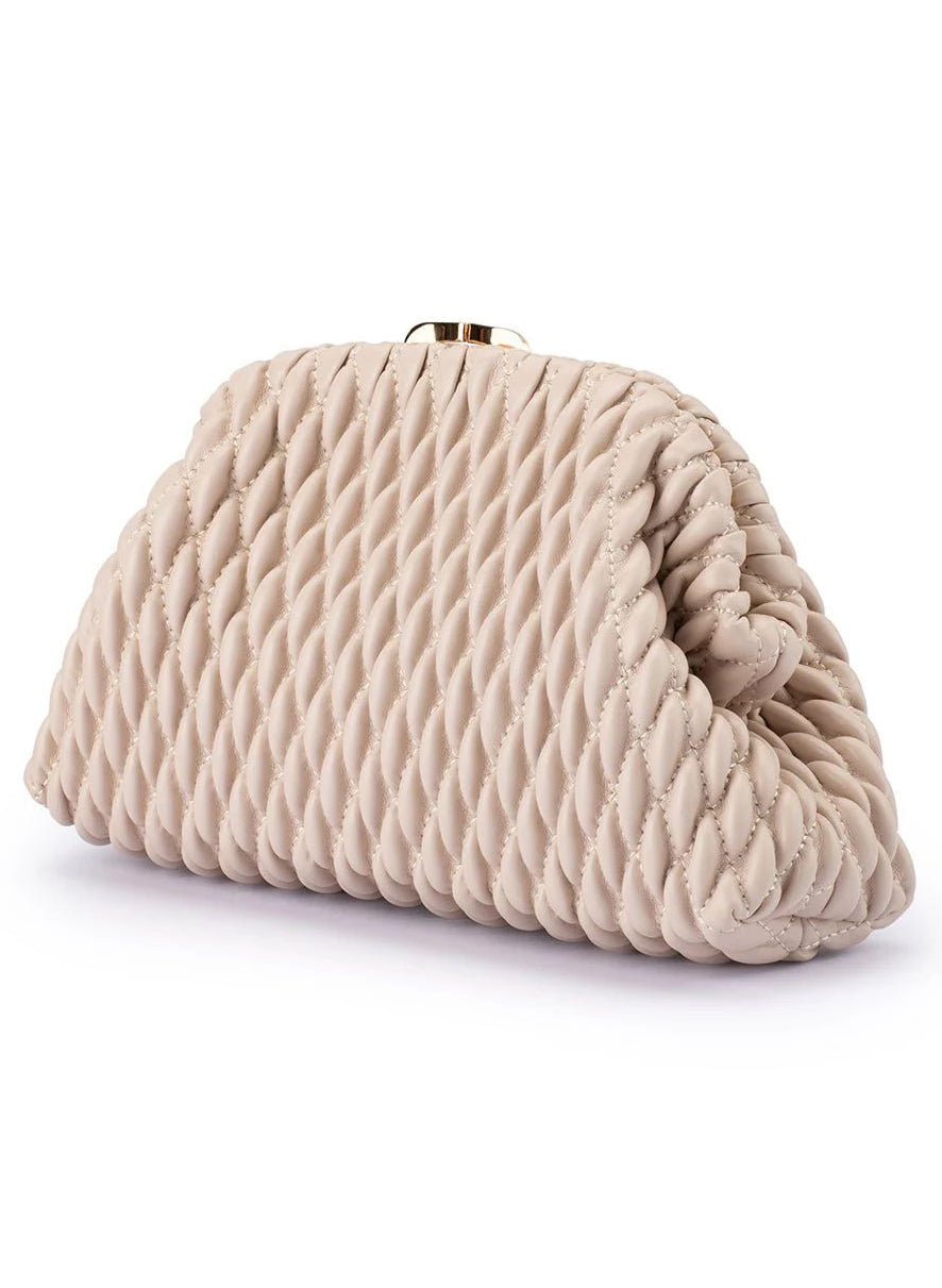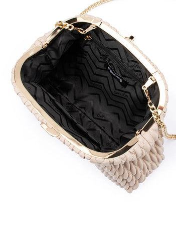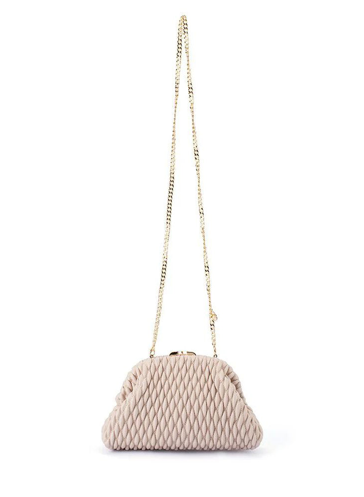 Clutch texturizado, cierre de click y cadena.