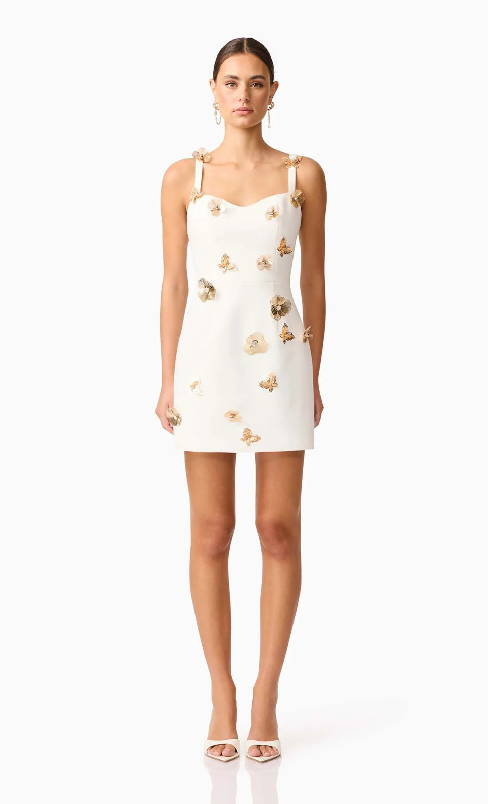 Vestido mini de stretch crepe, tirantes delgados, escote de corazón, detalle de aplicación dorada, corte al cuerpo y cierre invisible.
