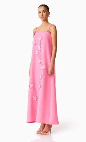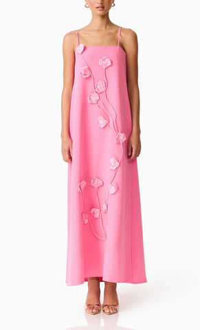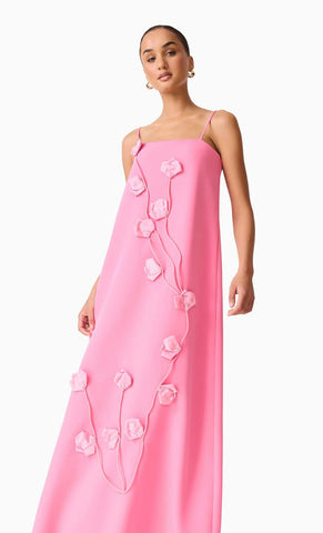 Vestido midi con detalle de bordado de flores en 3D, cuello cuadrado, tirantes delgados, corte recto, movimiento y cierre invisible.