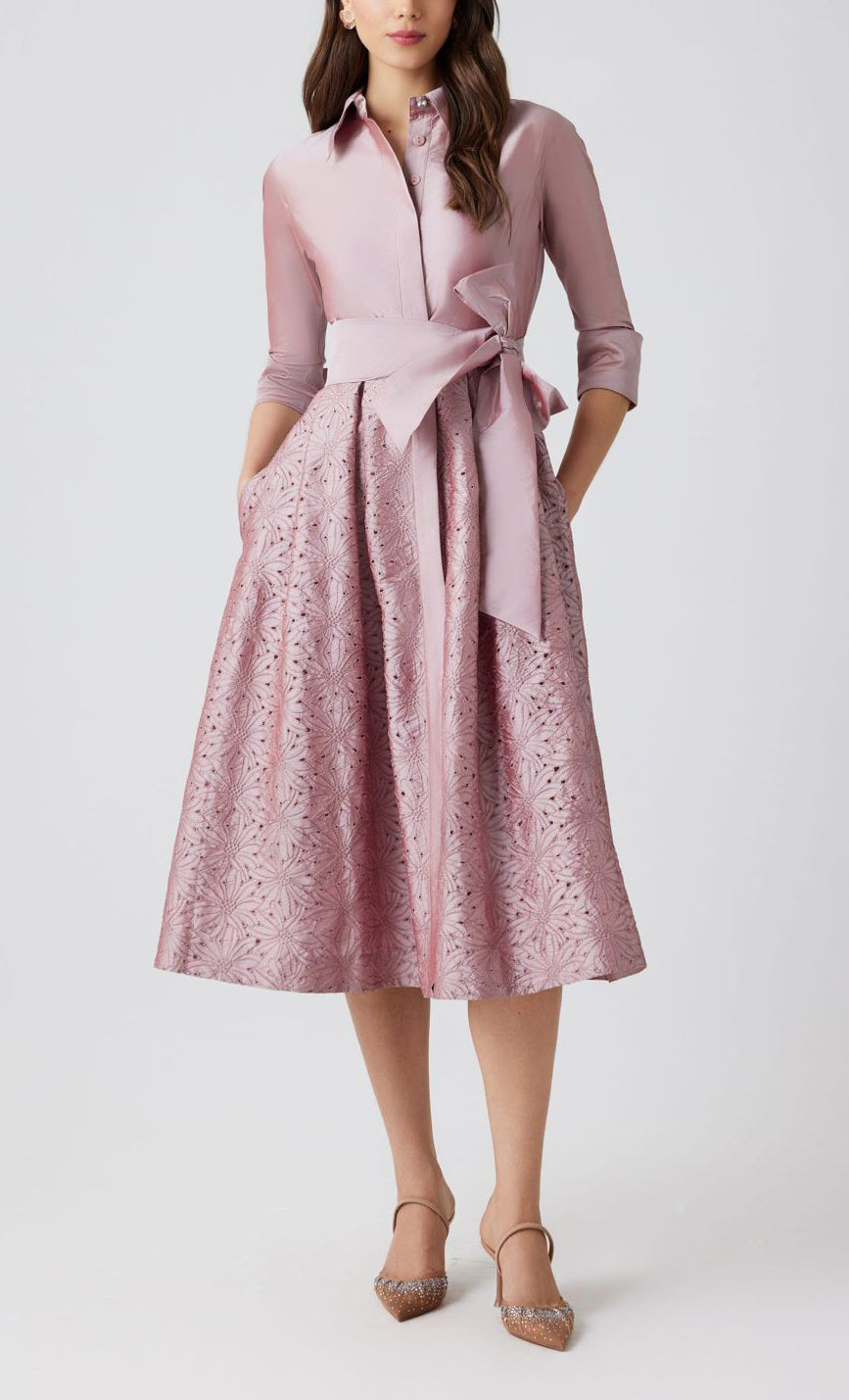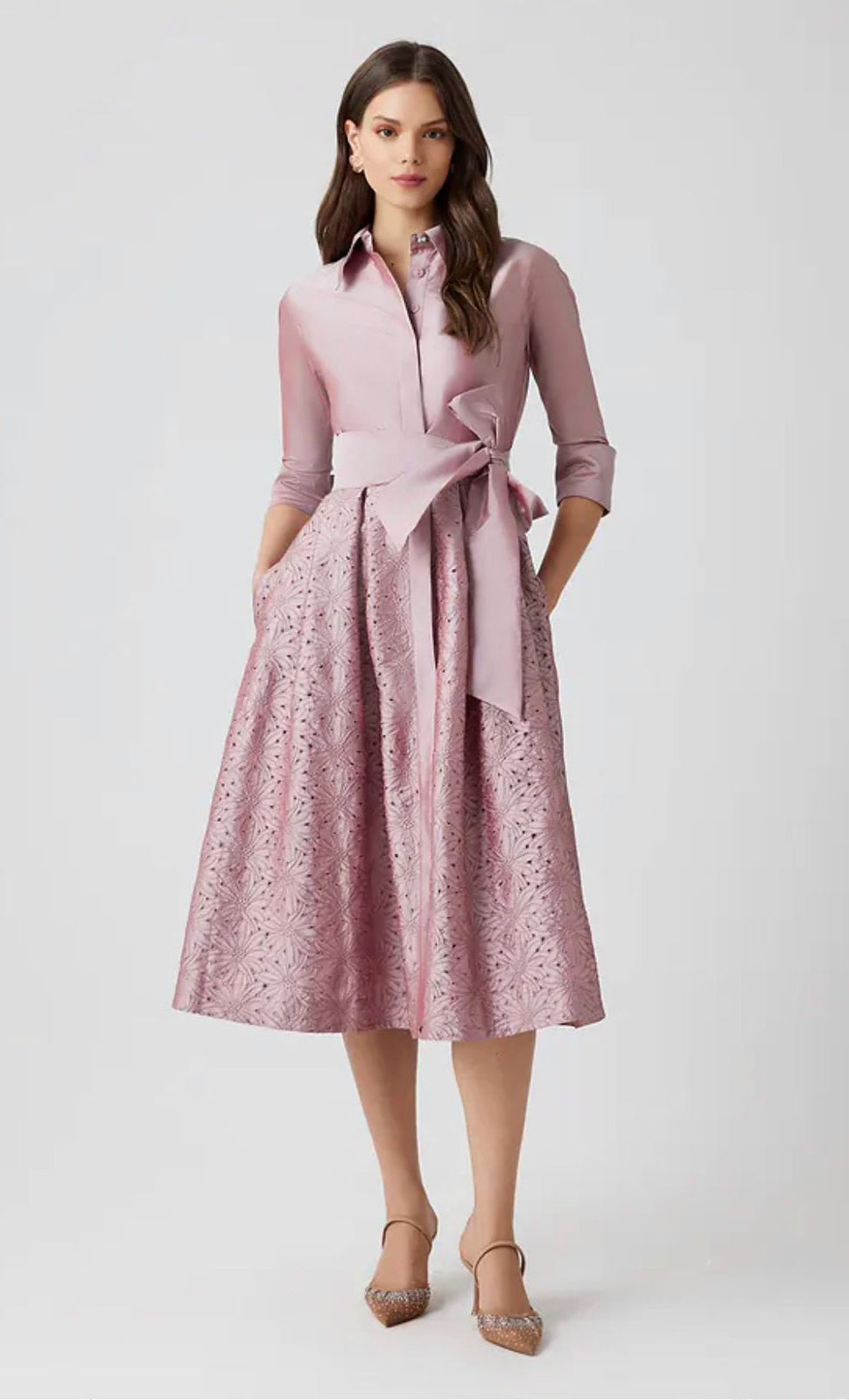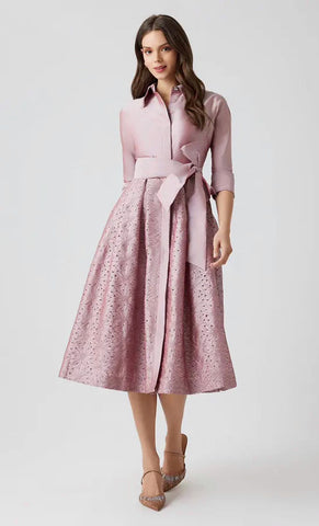 Vestido midi tipo camisero, manga 3/4, botones al frente, cinturón ajustable, detalle de bordado en falda y falda en corte A.