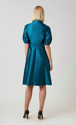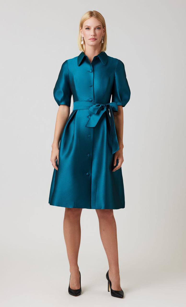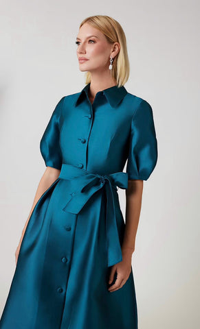 Vestido midi tipo camisero, manga corta abullonada, ajustado a la cintura, cinturón, falda en corte A, movimiento y botones al frente.