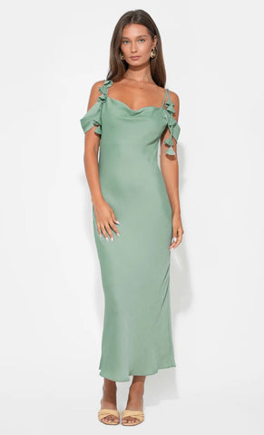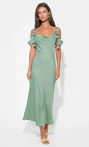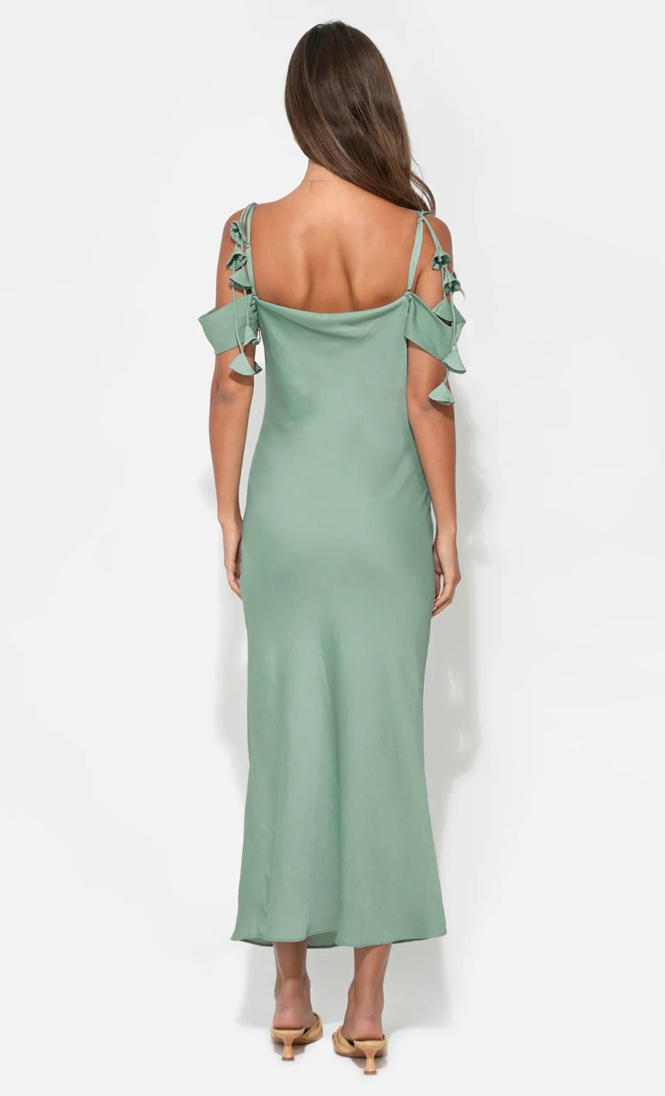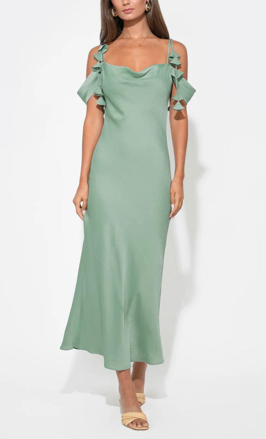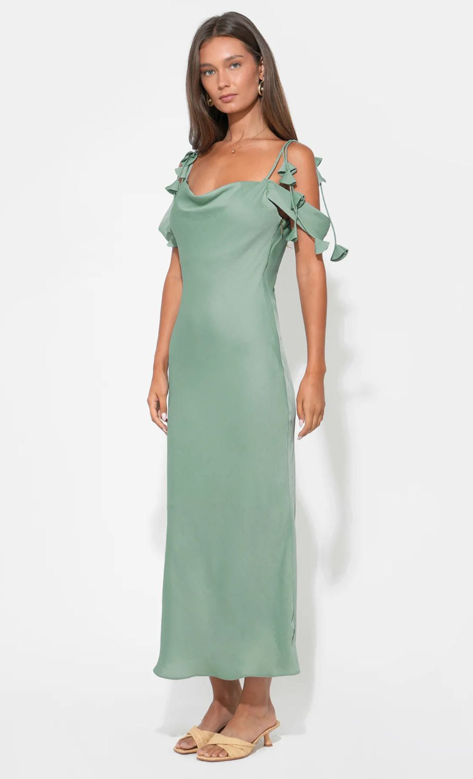 Vestido midi de satín texturizado, tirantes delgados con detalle de de flores en 3D, cuello tipo cowl, corte al cuerpo, movimiento y cierre invisible.