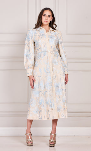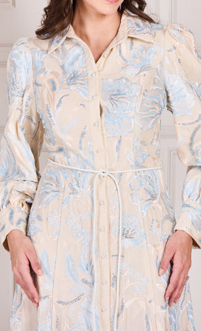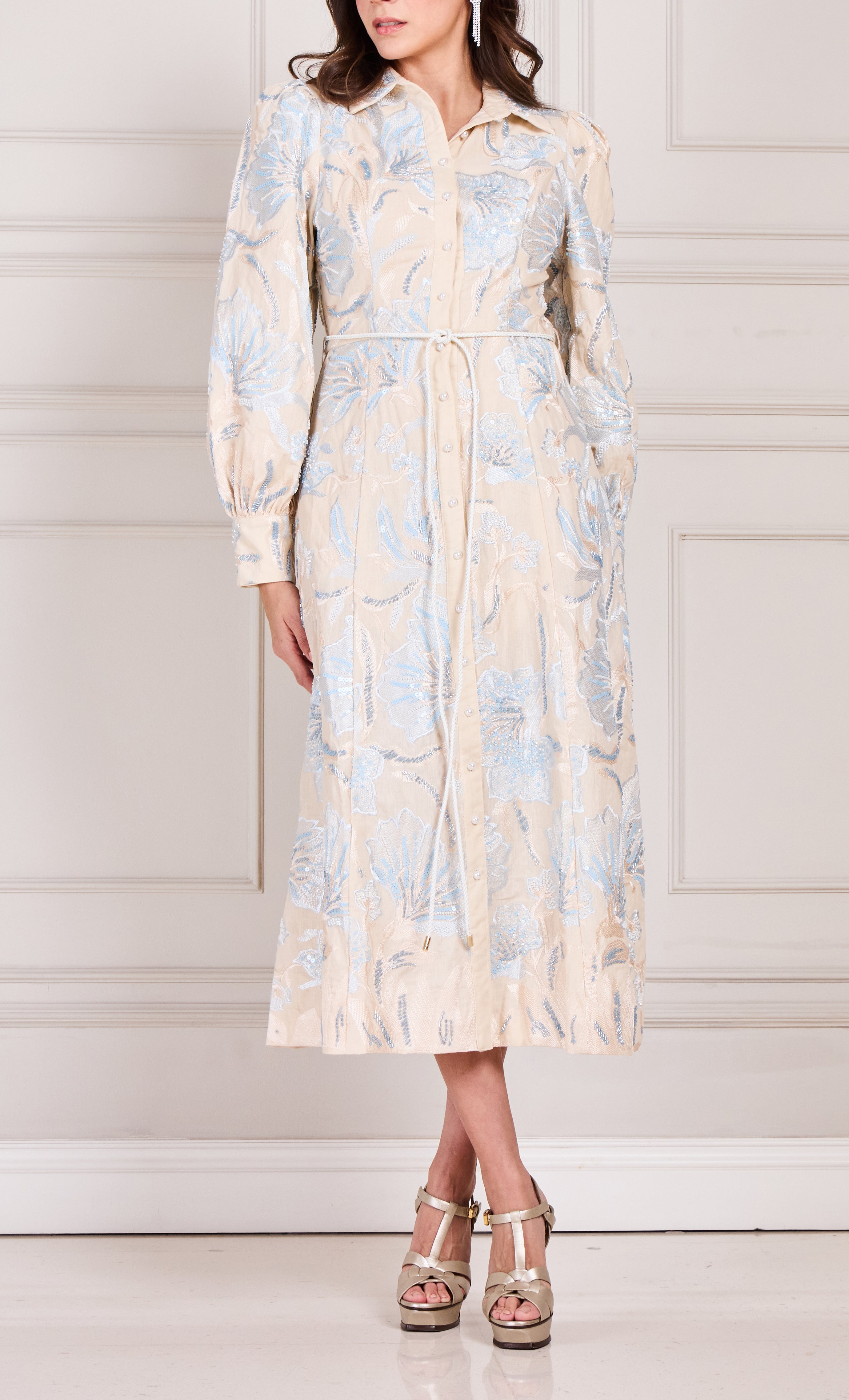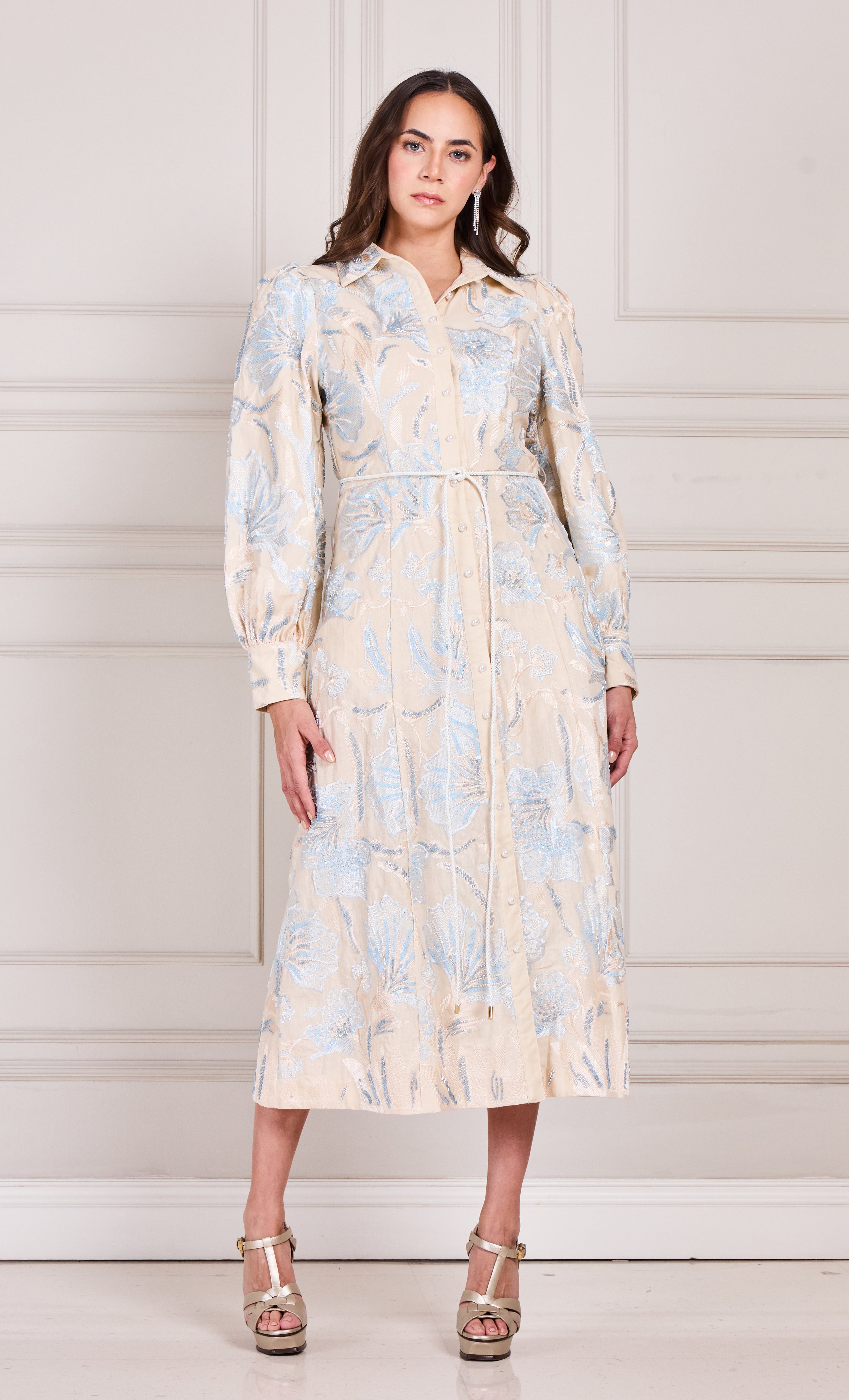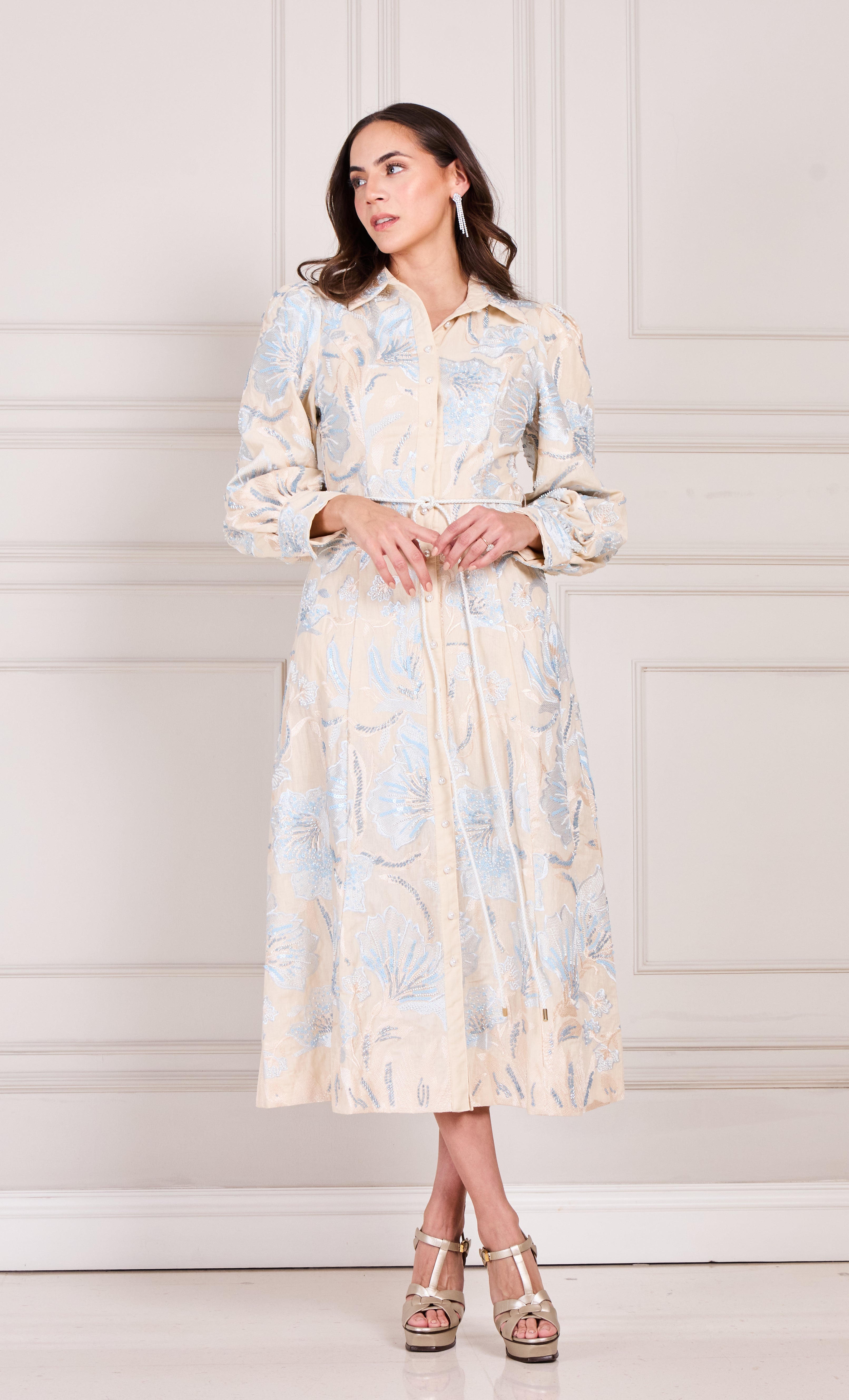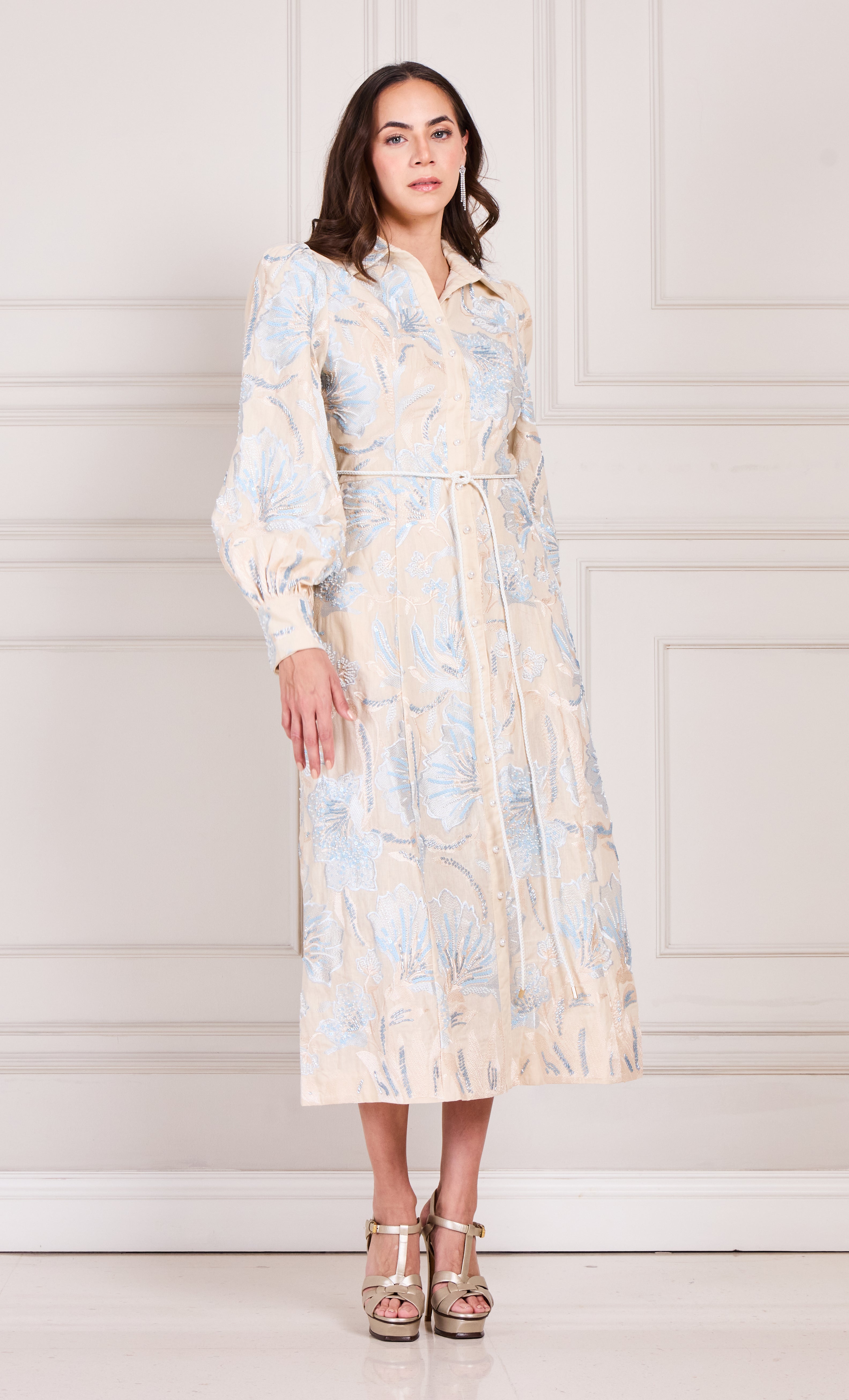 Vestido midi tipo camisero, completamente bordado, manga larga abullonada, cinturón ajustable, falda en corte A, movimiento y botones al frente.