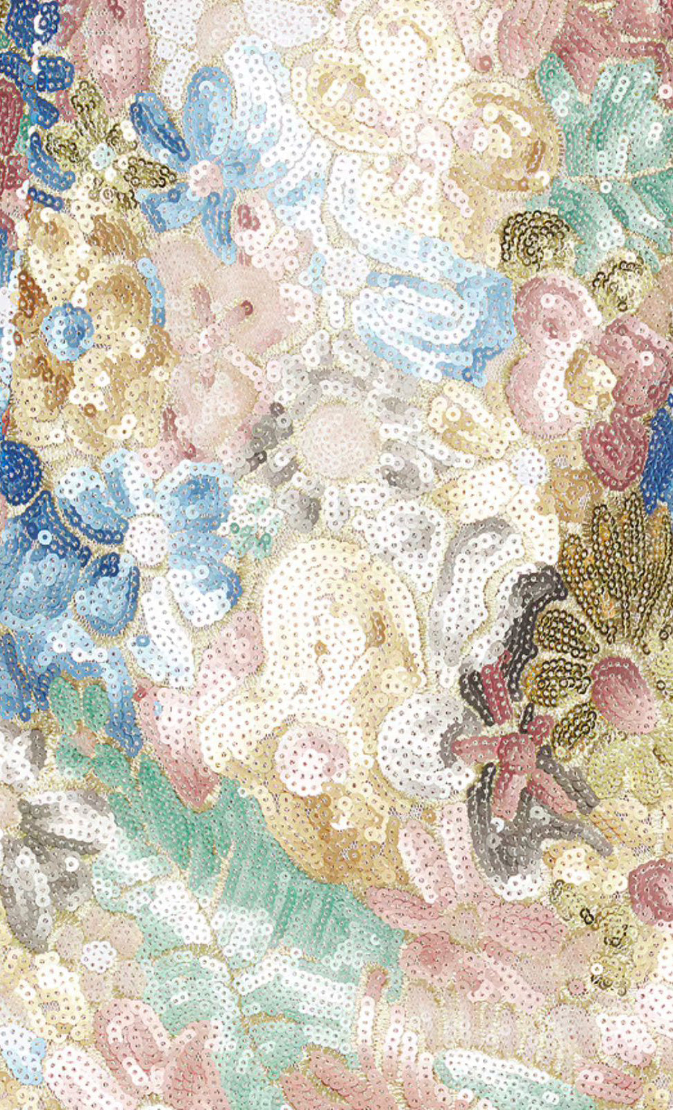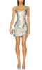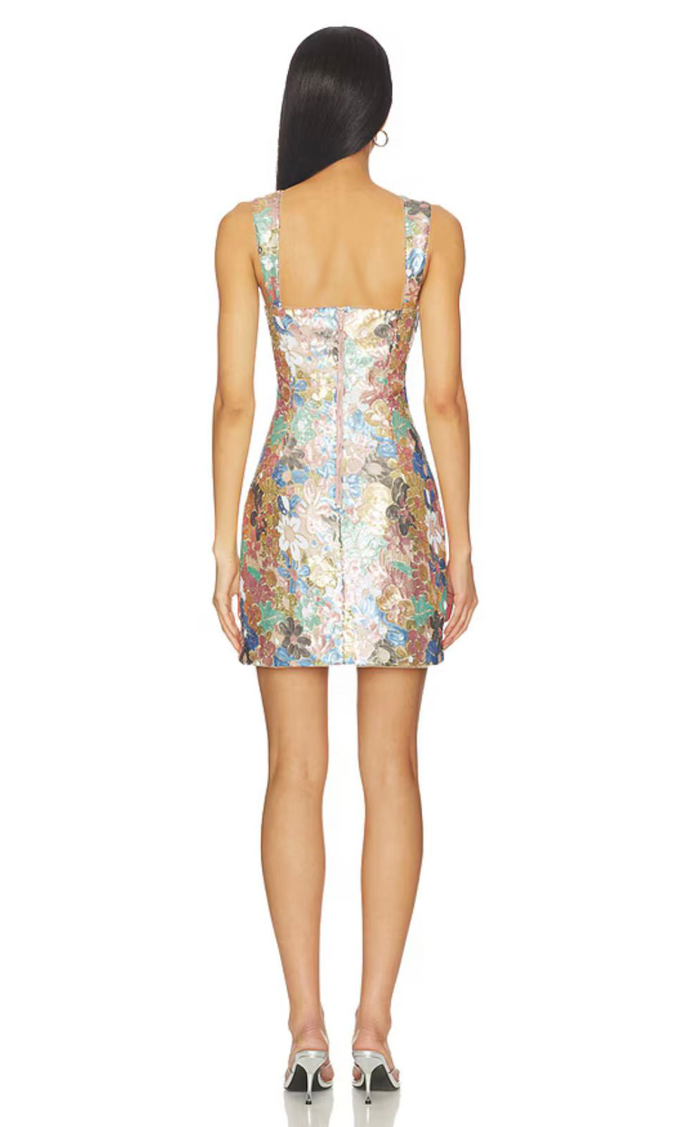 Vestido mini completamente bordado de fina lentejuela, escote cuadrado, tirantes gruesos, corte al cuerpo, detalle de falda asimétrica y cierre metálico.