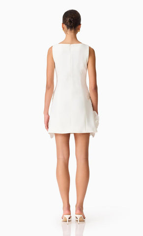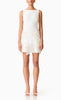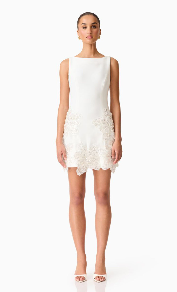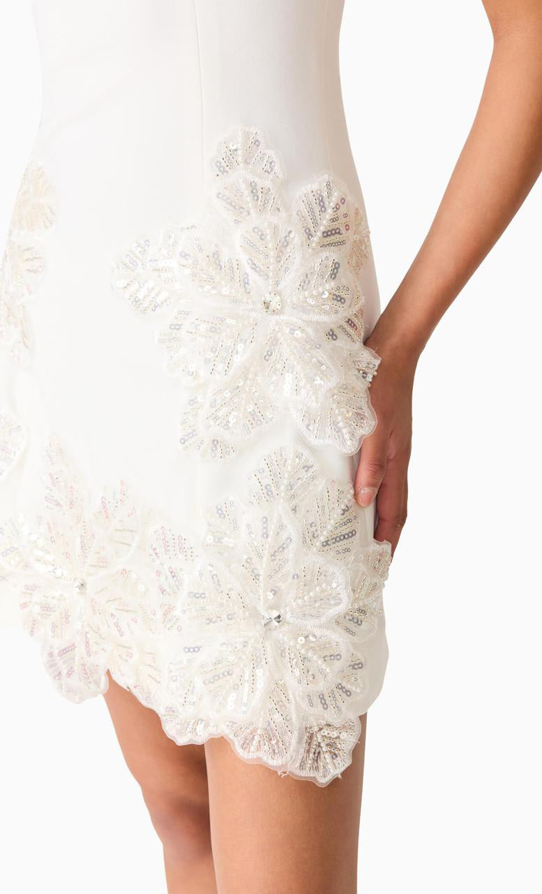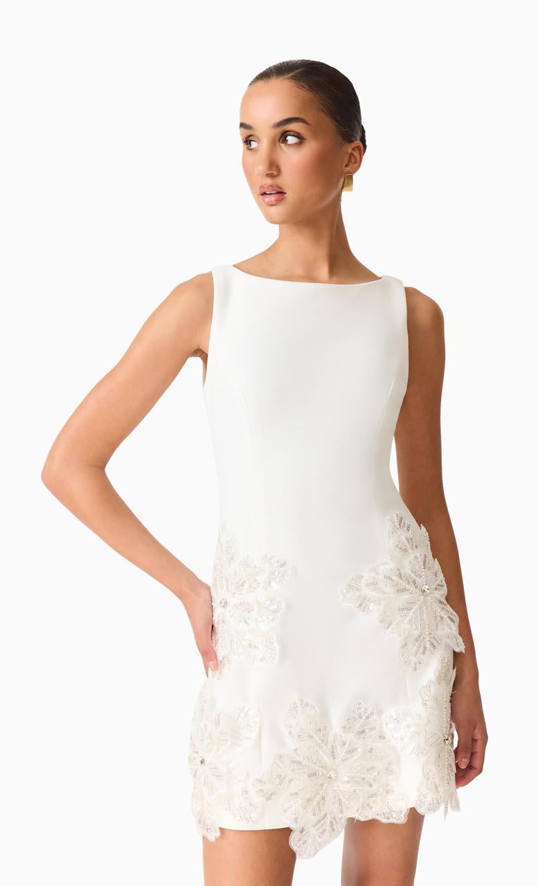 Vestido mini de stretch crepe, detalle de bordado con lentejuela y canutillo, cuello circular, corte al cuerpo y cierre invisible.