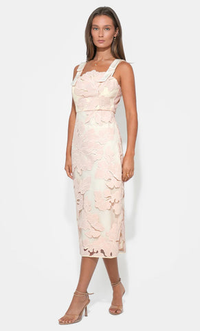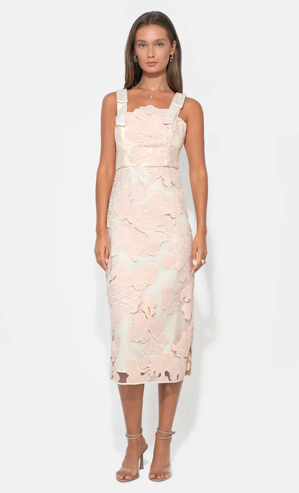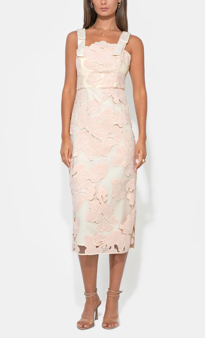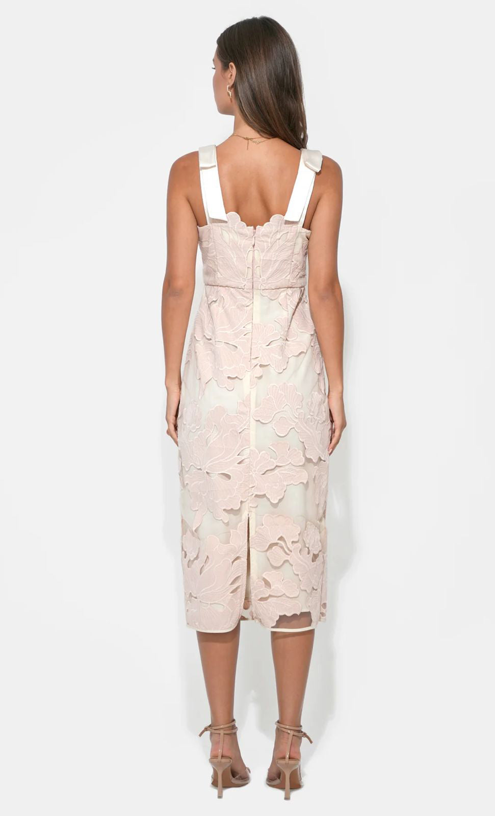 Vestido midi de tul con encaje, tirantes gruesos con detalle de moño, corte al cuerpo, abertura posterior y cierre invisible.