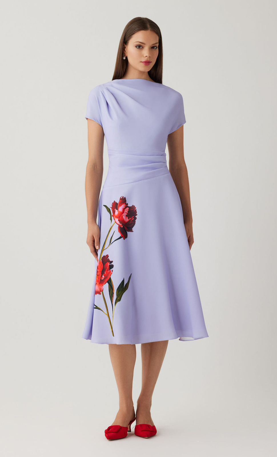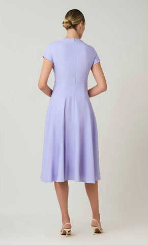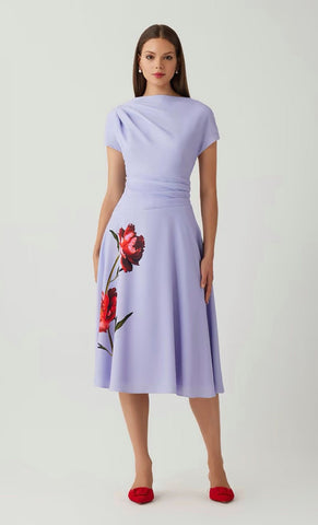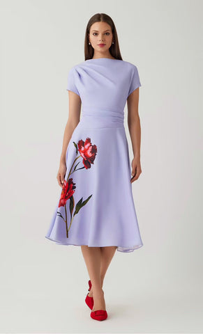Vestido midi de crepe con print, manga corta, detalle de pliegues en hombro y cintura, falda en corta A con movimiento y cierre invisible.