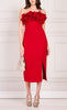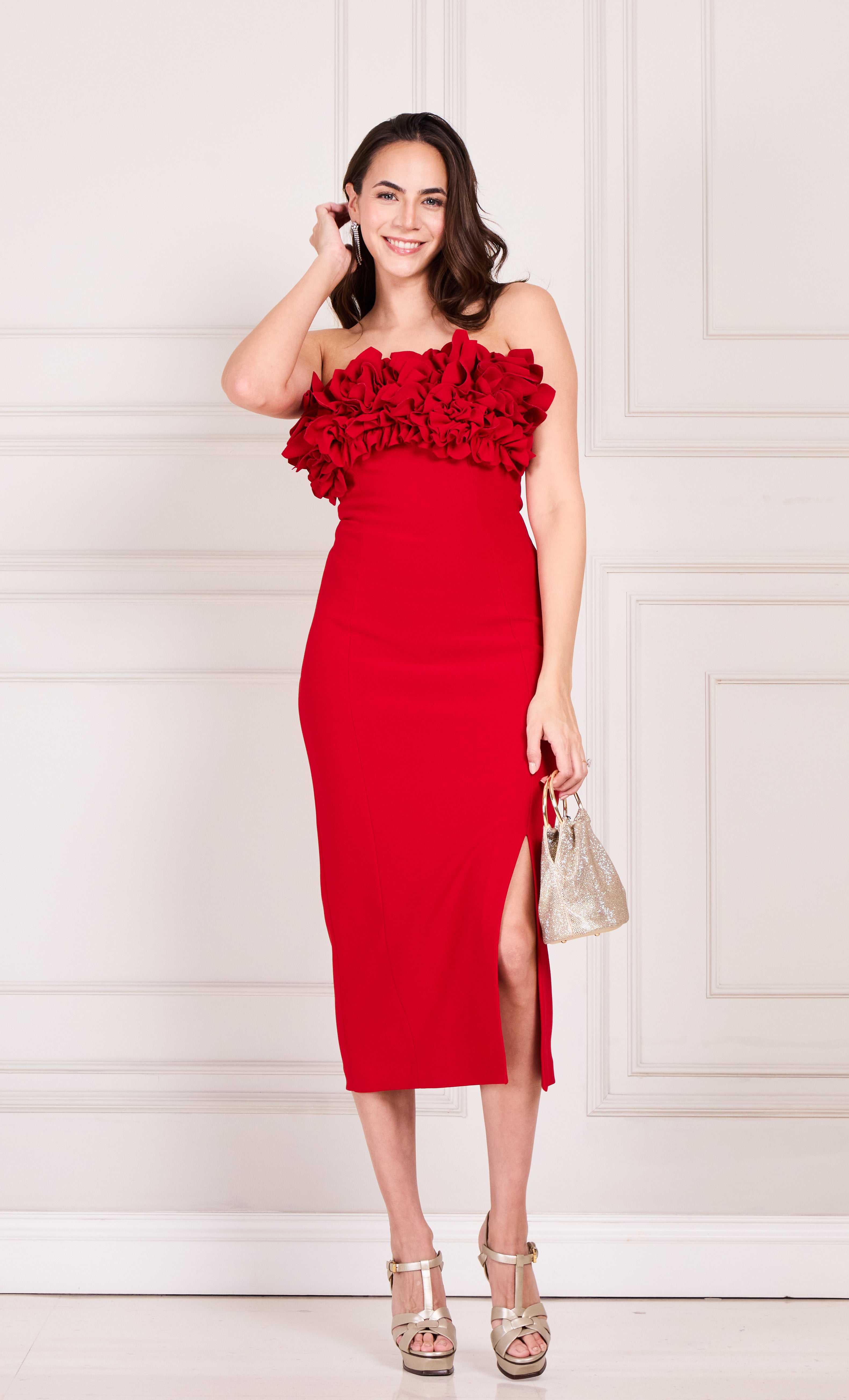 Vestido midi de stretch crepe, flores en 3D en parte superior, tirantes delgados, corte al cuerpo, abertura lateral y cierre invisible.