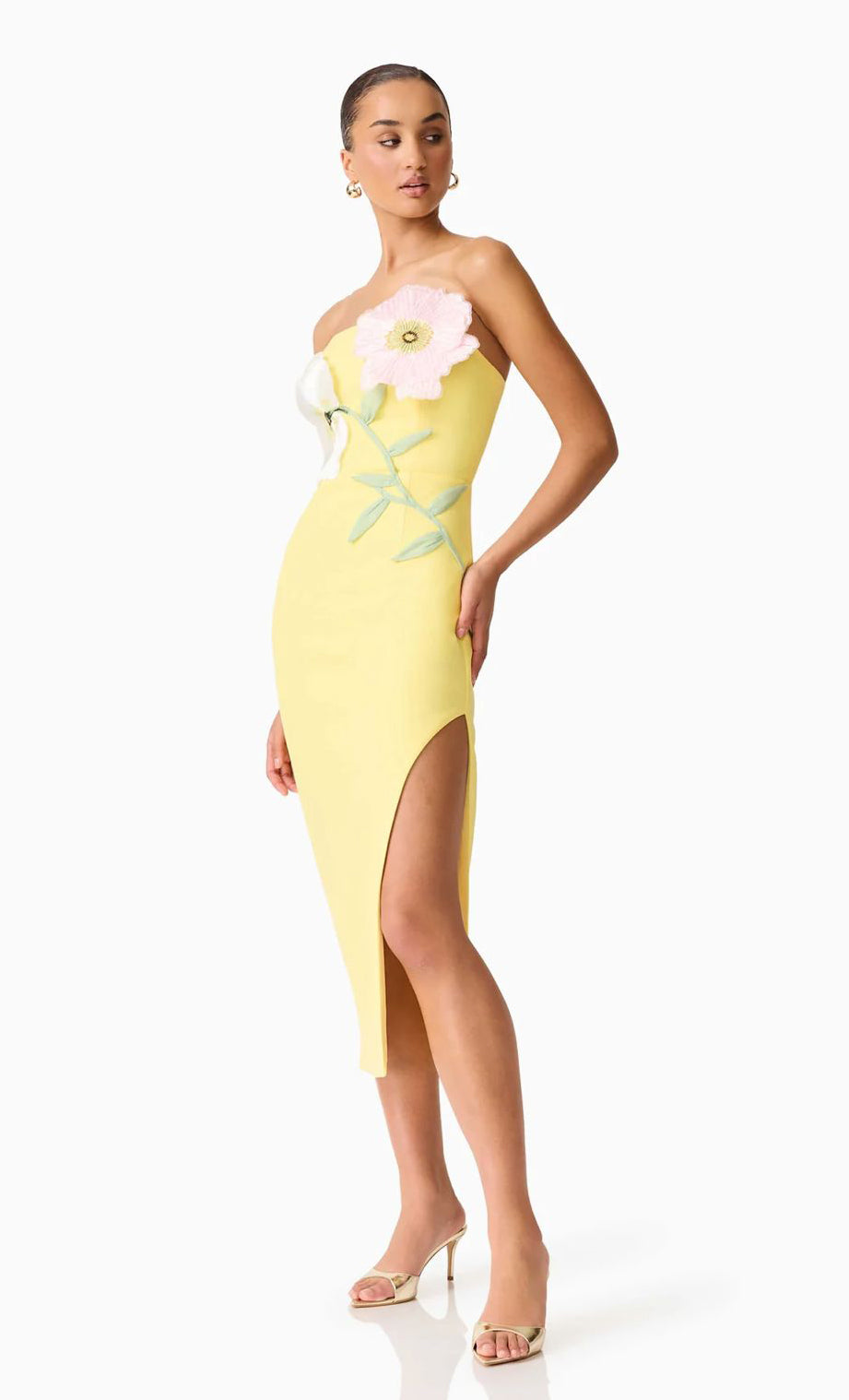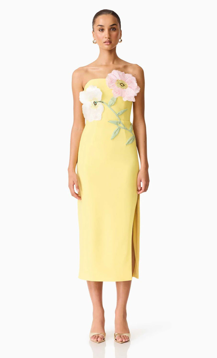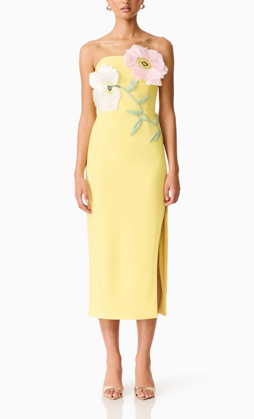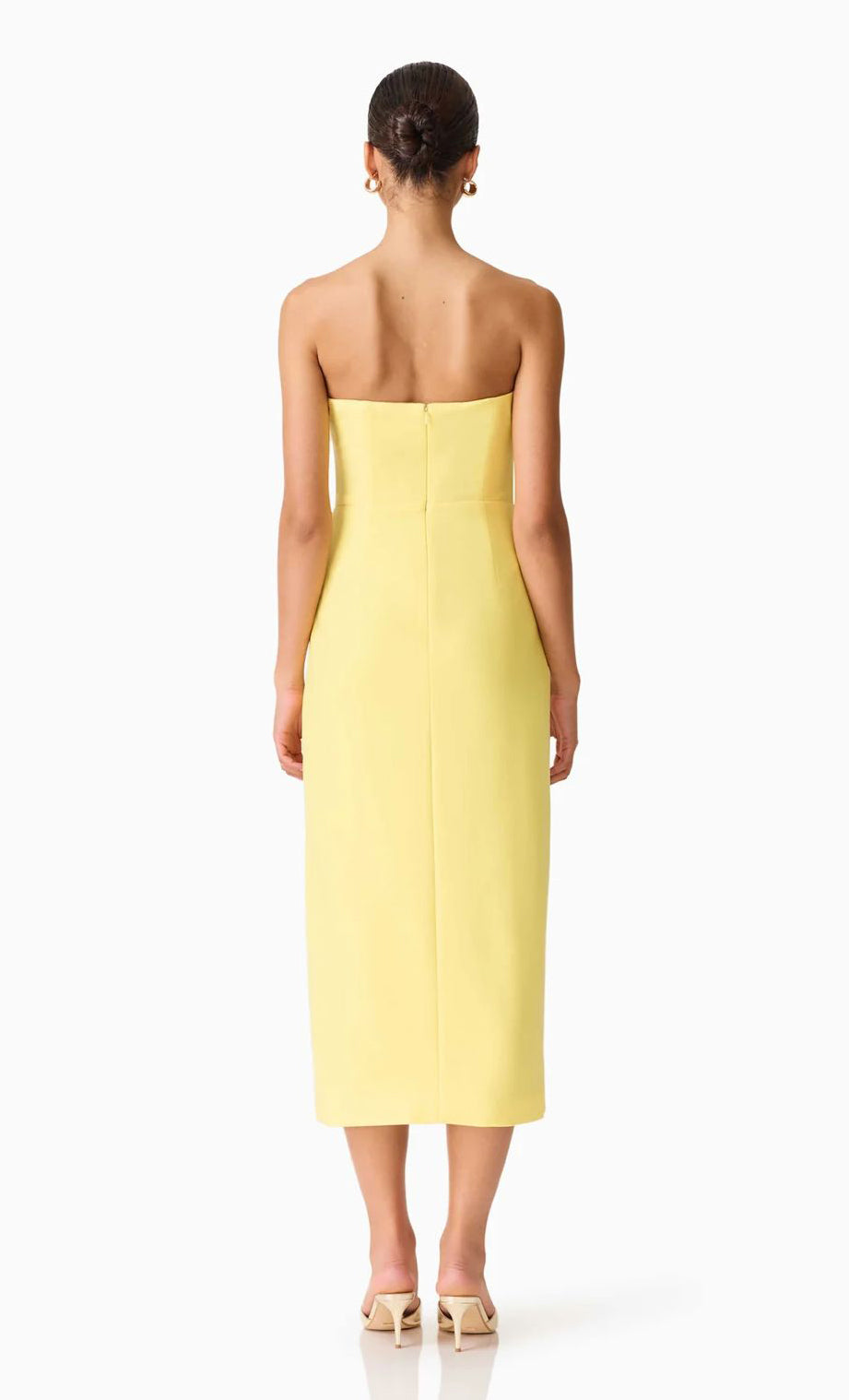 Vestido midi de stretch crepe, strapless, corte al cuerpo, abertura lateral y cierre invisible.
