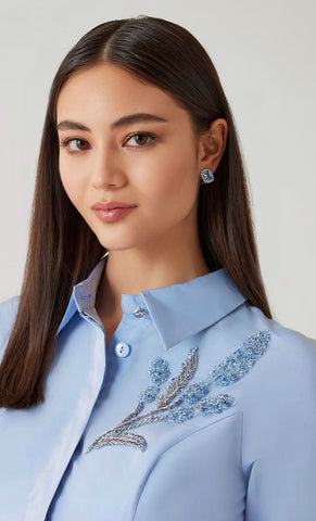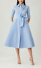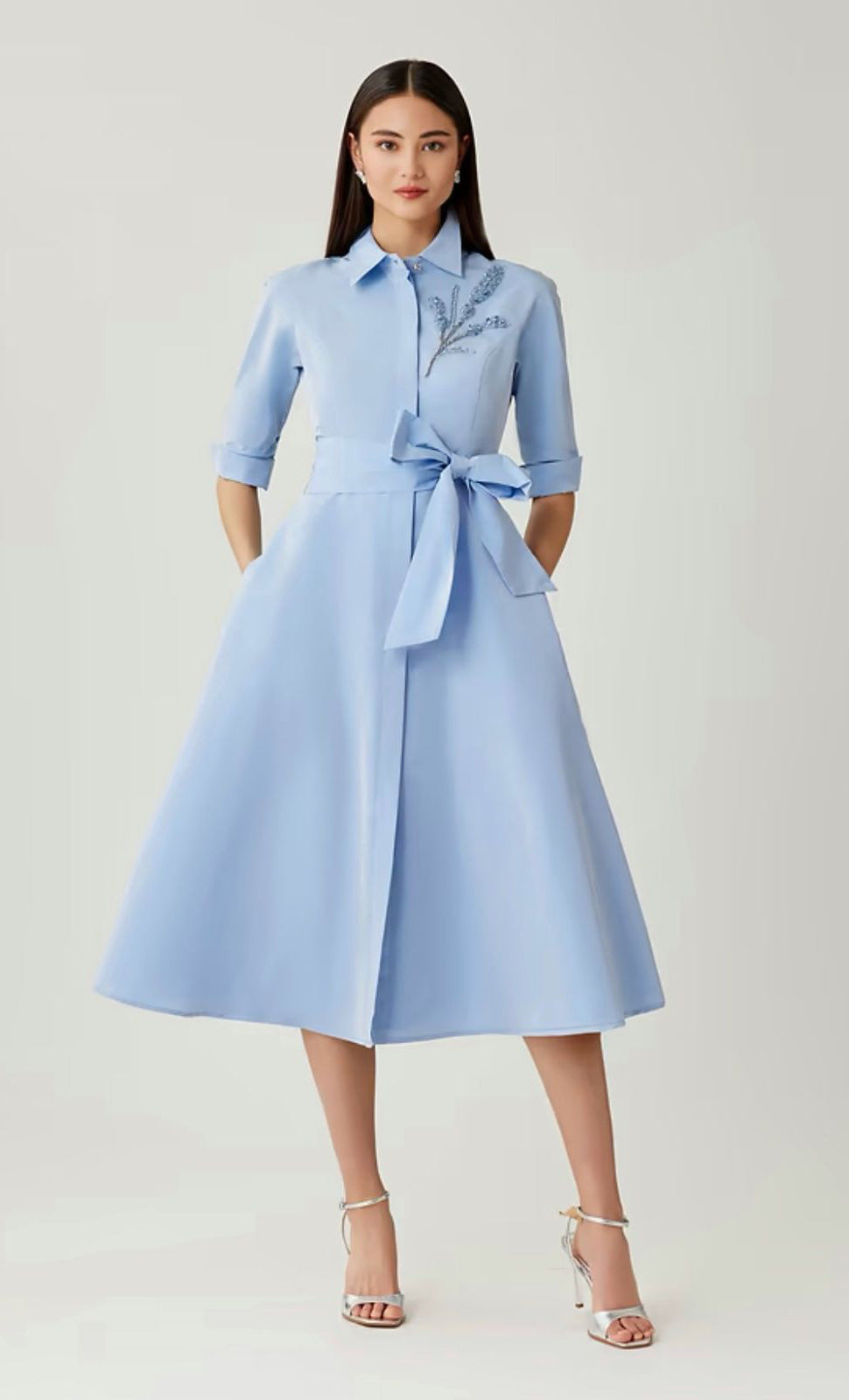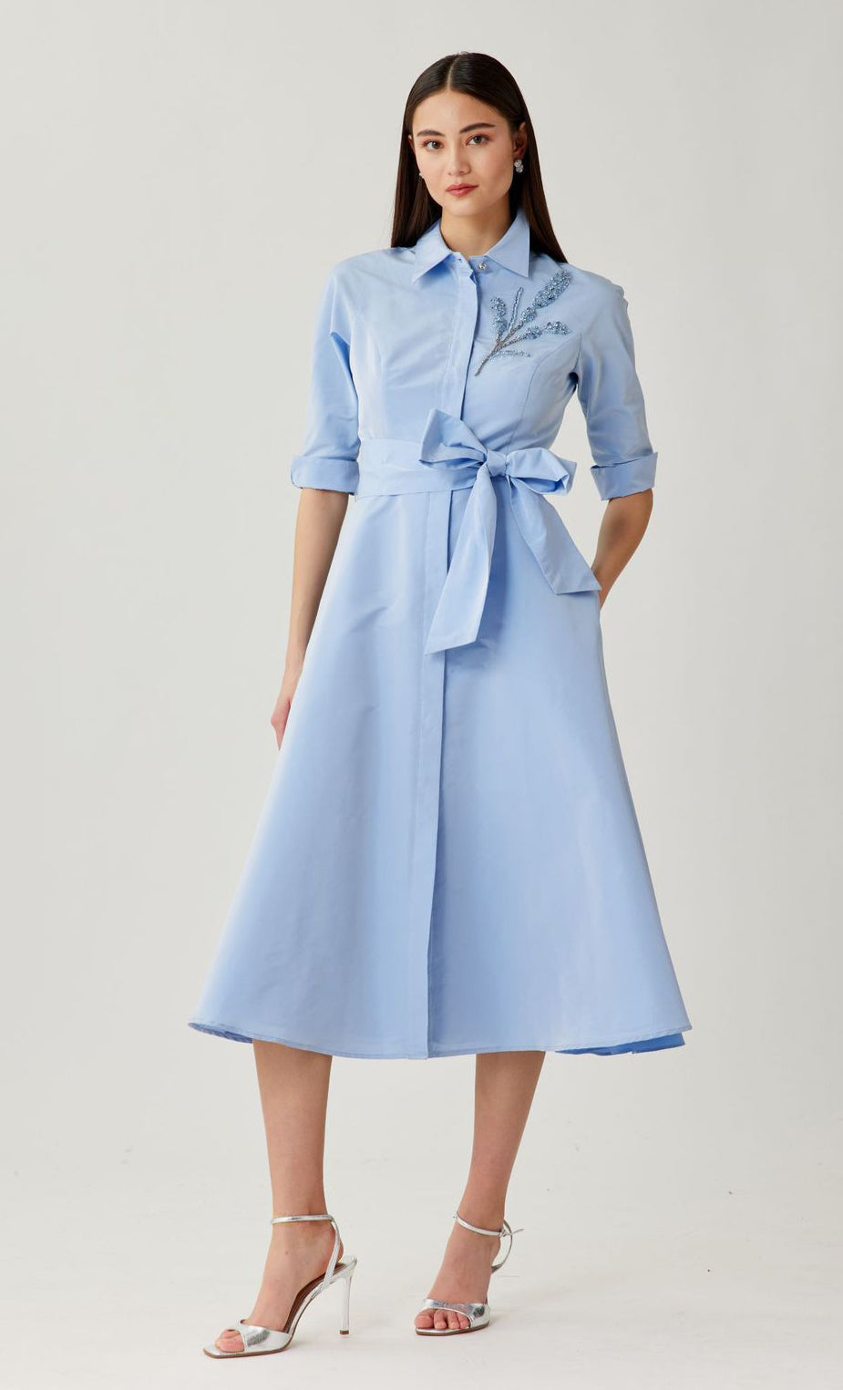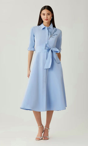 Vestido midi de taffeta tipo camisero, detalle de bordado al frente, mangas 3/4, cinturón ajustable, falda en corte A con movimiento y botones al frente.