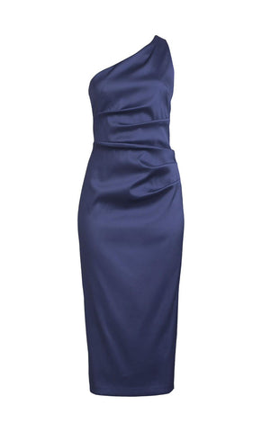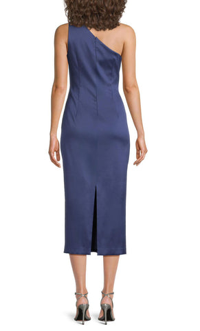 Vestido midi de tafeta stretch, un hombro, detalle de pliegues en cintura, corte al cuerpo, abertura posterior y cierre invisible.
