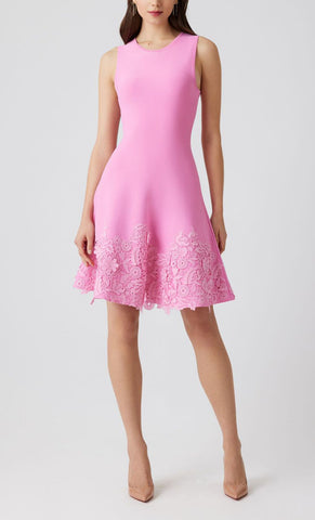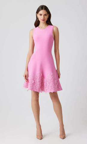 Vestido mini de tela stretch, cuello redondo, falda en corte A con bordado de flores, movimiento y cierre invisible.