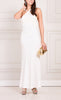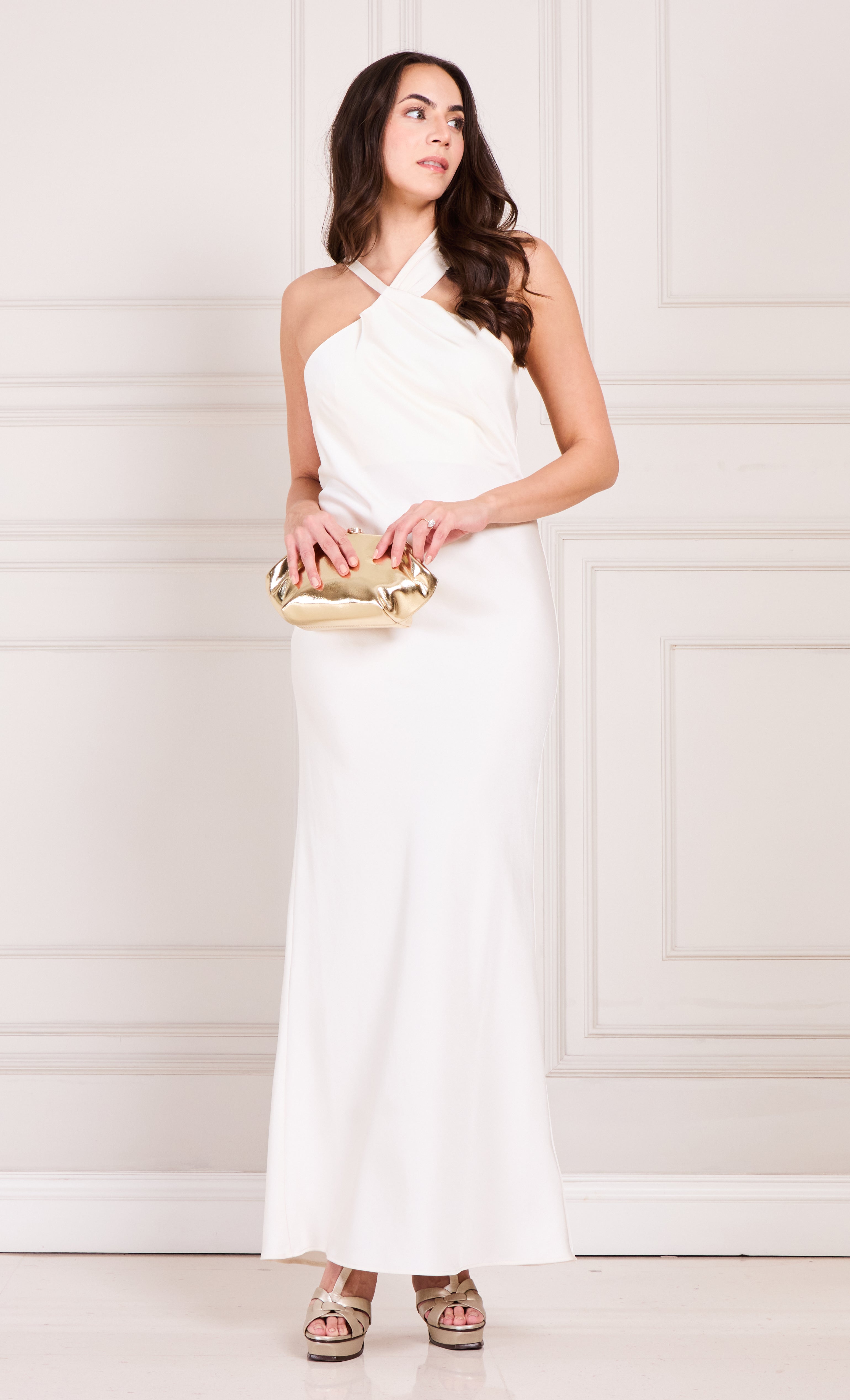 Vestido midi de satín, cuello halter asimétrico, escote en espalda con tiras ajustables, corte al cuerpo, movimiento y cierre invisible.