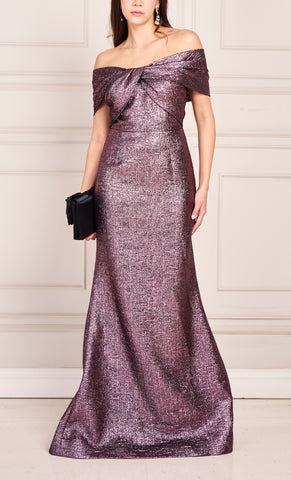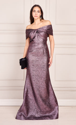 Vestido largo de tela texturizada con detalles metálicos, manga off the shoulder, detalle de nudo al frente, corte al cuerpo y cierre invisible.
