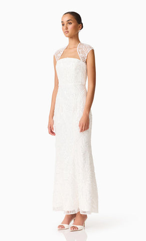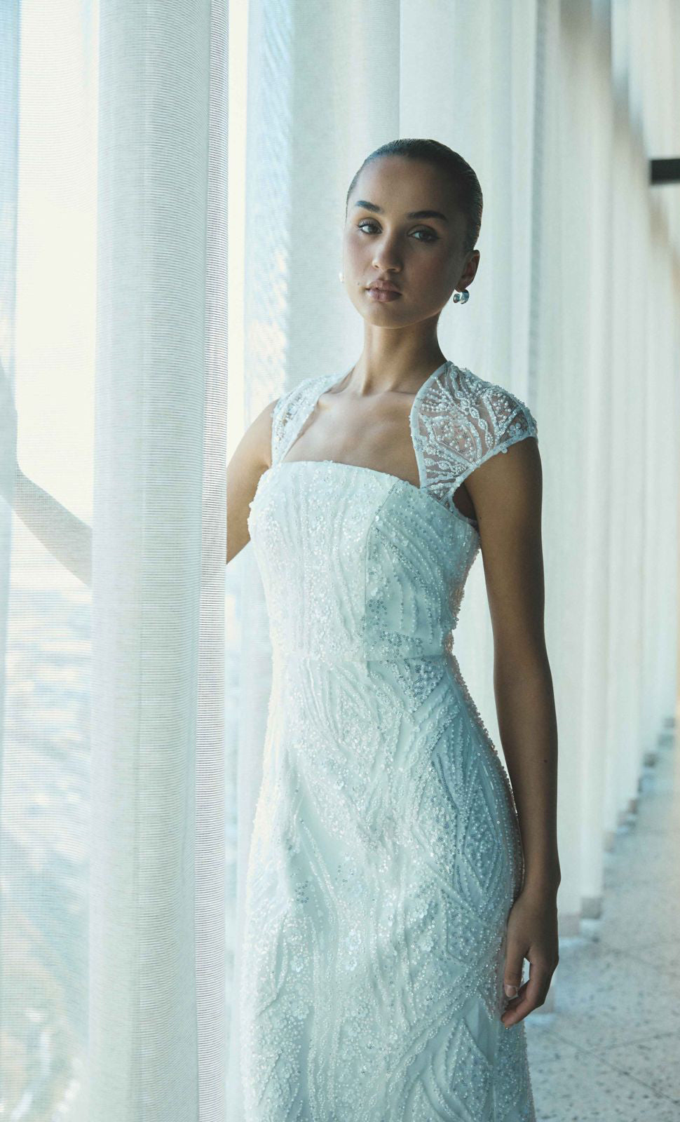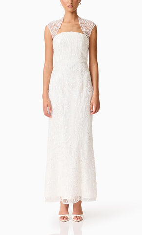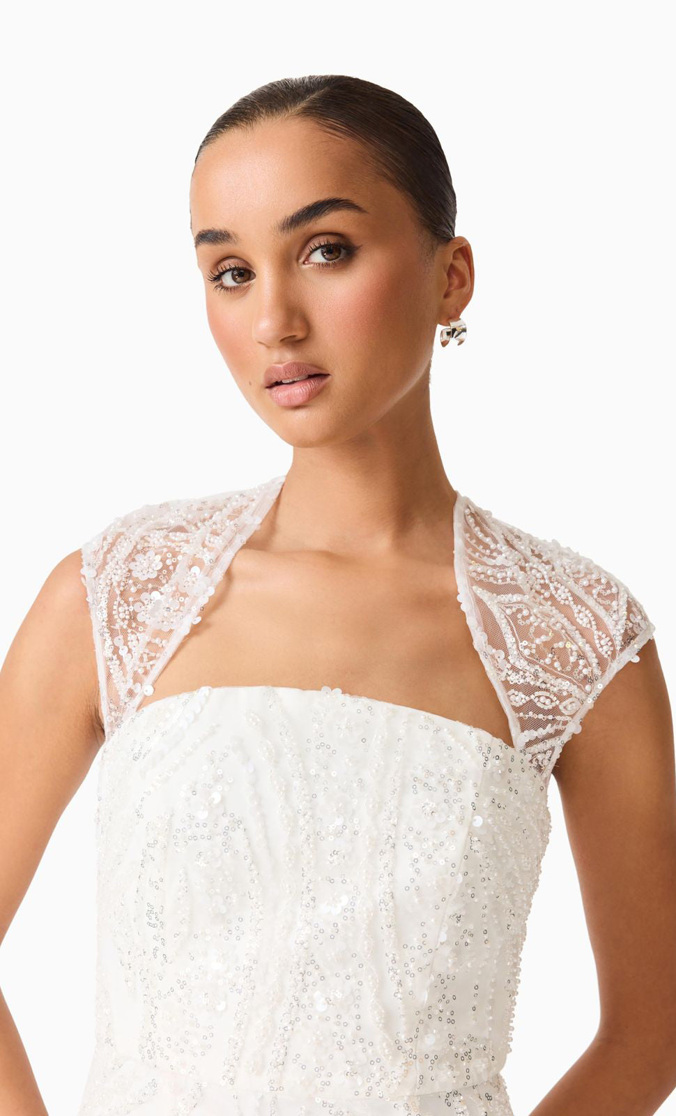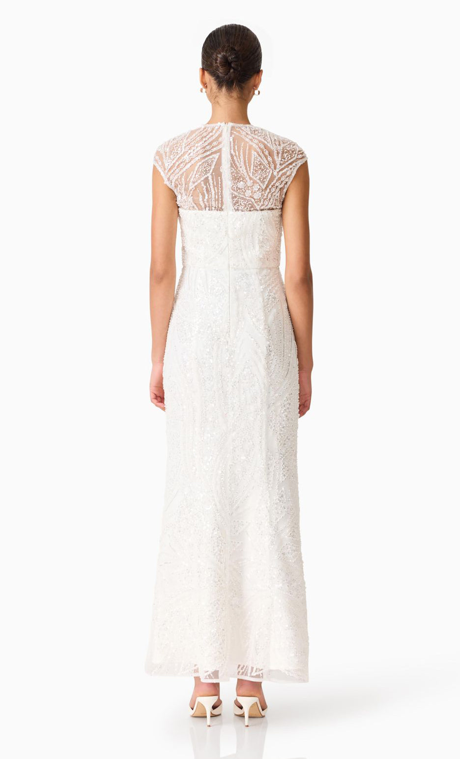 Vestido largo de tul completamente bordado de fina lentejuela y canutillo, detalle de transparencia en parte superior, corte al cuerpo, movimiento y cierre invisible.