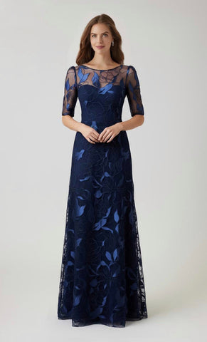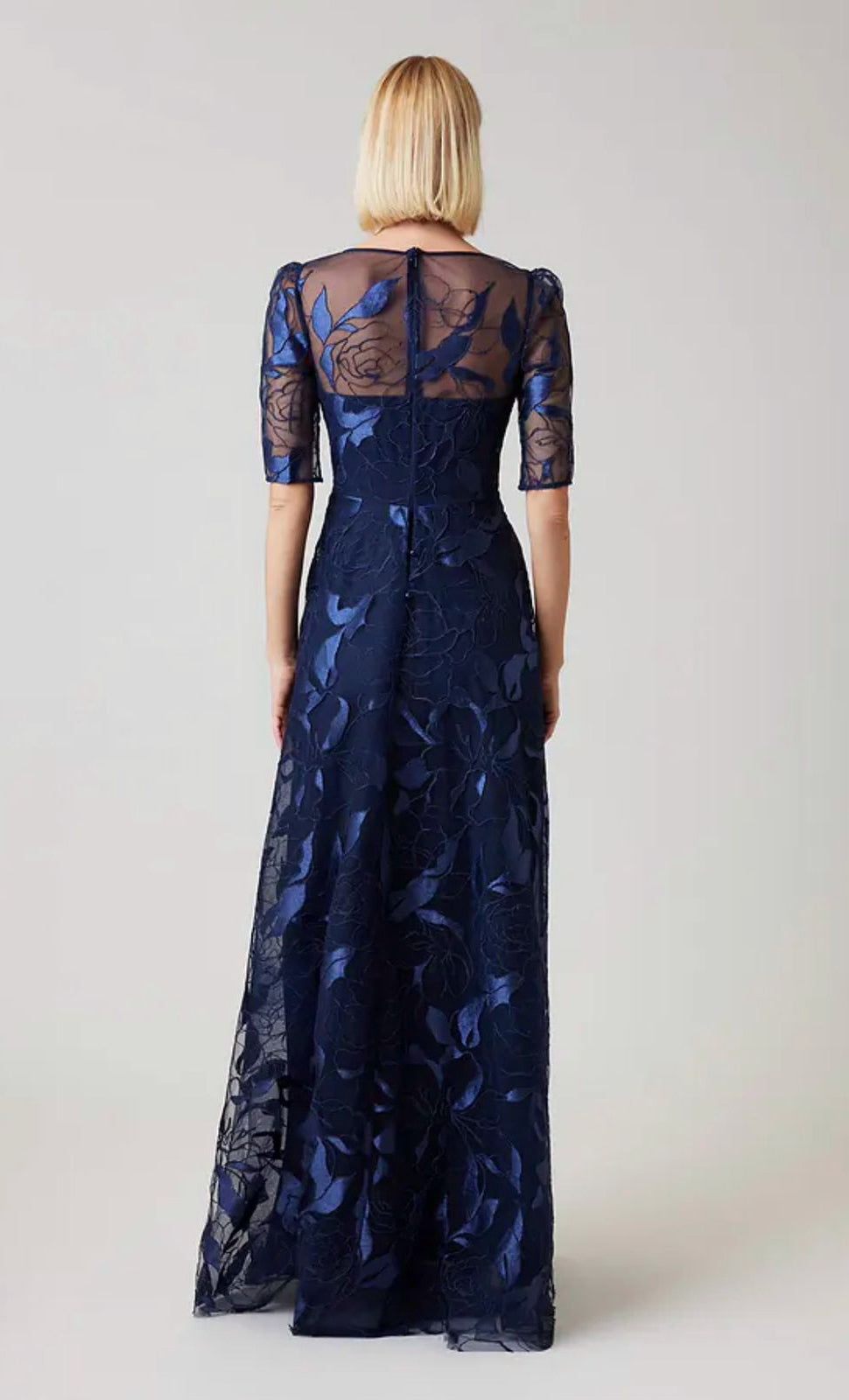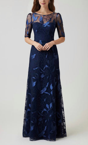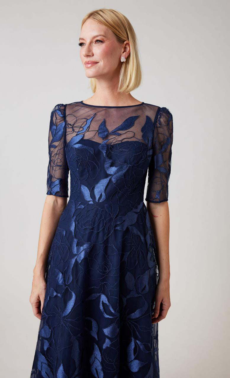 Vestido largo de tul completamente bordado, manga corta, ajustado a la cintura, falda en corte A con movimiento y cierre invisible.