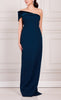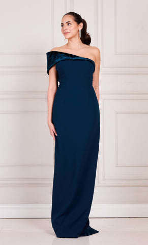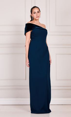 Vestido largo de stretch crepe, una manga off the shoulder de terciopelo, detalle de moño en espalda, corte al cuerpo, abertura posterior y cierre invisible.