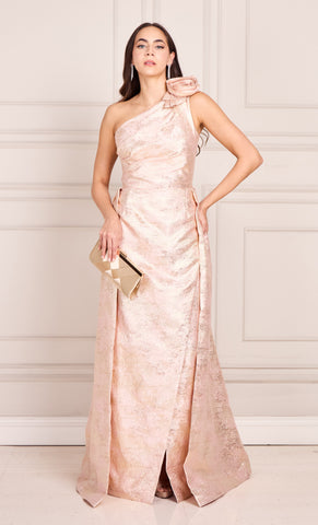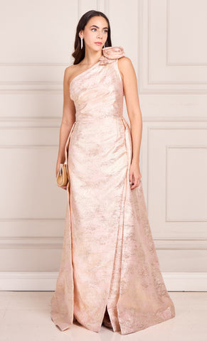 Vestido largo de tela brocada, un hombro con detalle de flor 3D, pliegues en cintura, sobre falda, abertura al frente y cierre invisible.