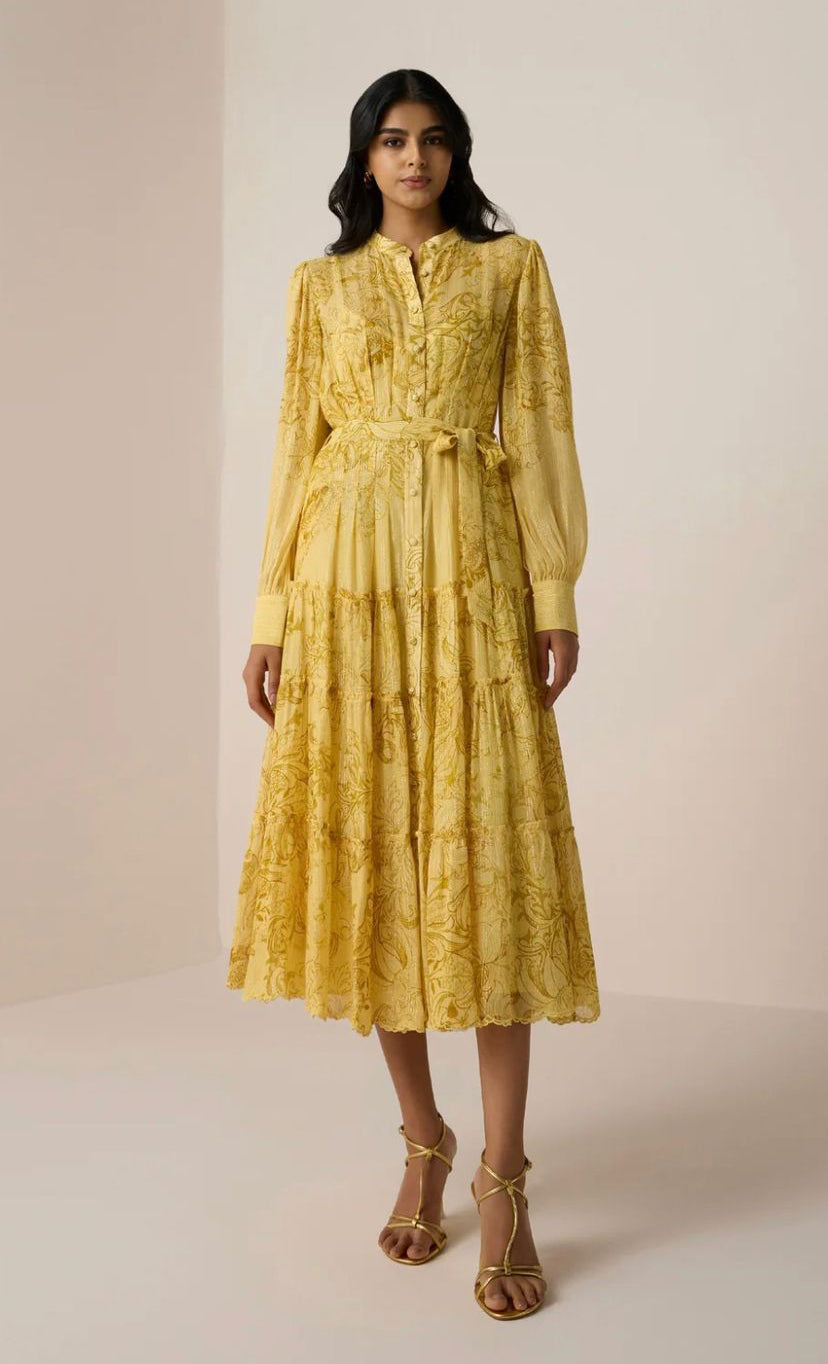Vestido midi de gasa con print tipo camisero, manga larga abullonada, cinturón ajustable, botones al frente, falda en corte A y movimiento.