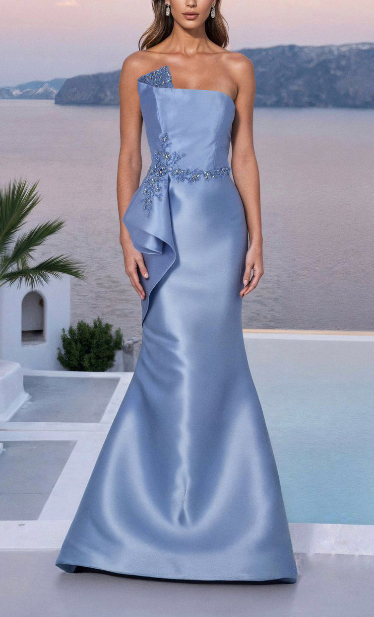 Vestido largo de taffeta, strapless, ajustado a al cintura con detalle de bordado, olán en costado, corte al cuerpo y cierre invisible.