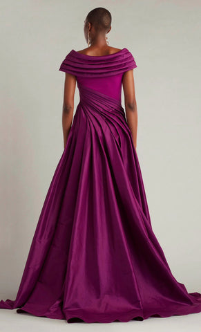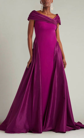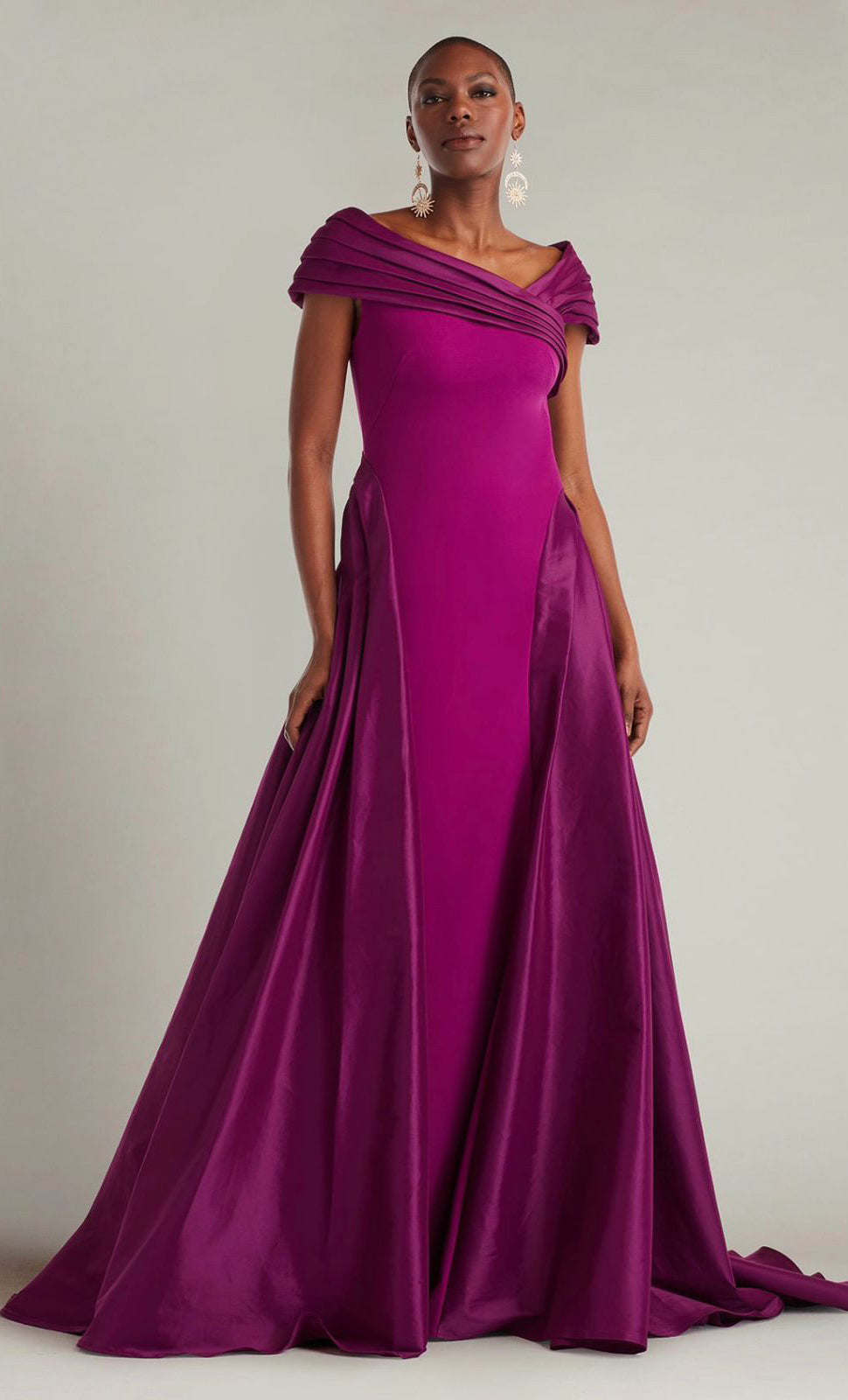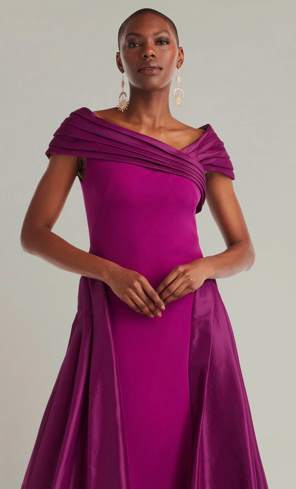 Vestido largo de stretch crepe, manga off the shoulder, detalle de falda de taffeta con plisado, corte A, movimiento y cierre lateral invisible.