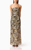 Vestido largo strapless completamente bordado de lentejuela, corte al cuerpo, falda con transparencia y cierre metálico.
