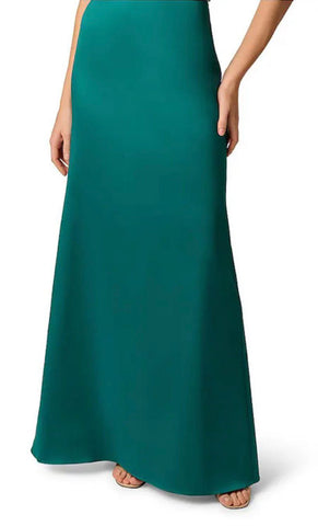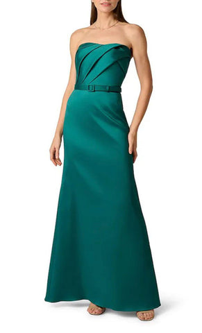 Vestido largo de mikado, strapless, detalle de pliegues al frente, cinturón ajustable, corte al cuerpo y cierre invisible.