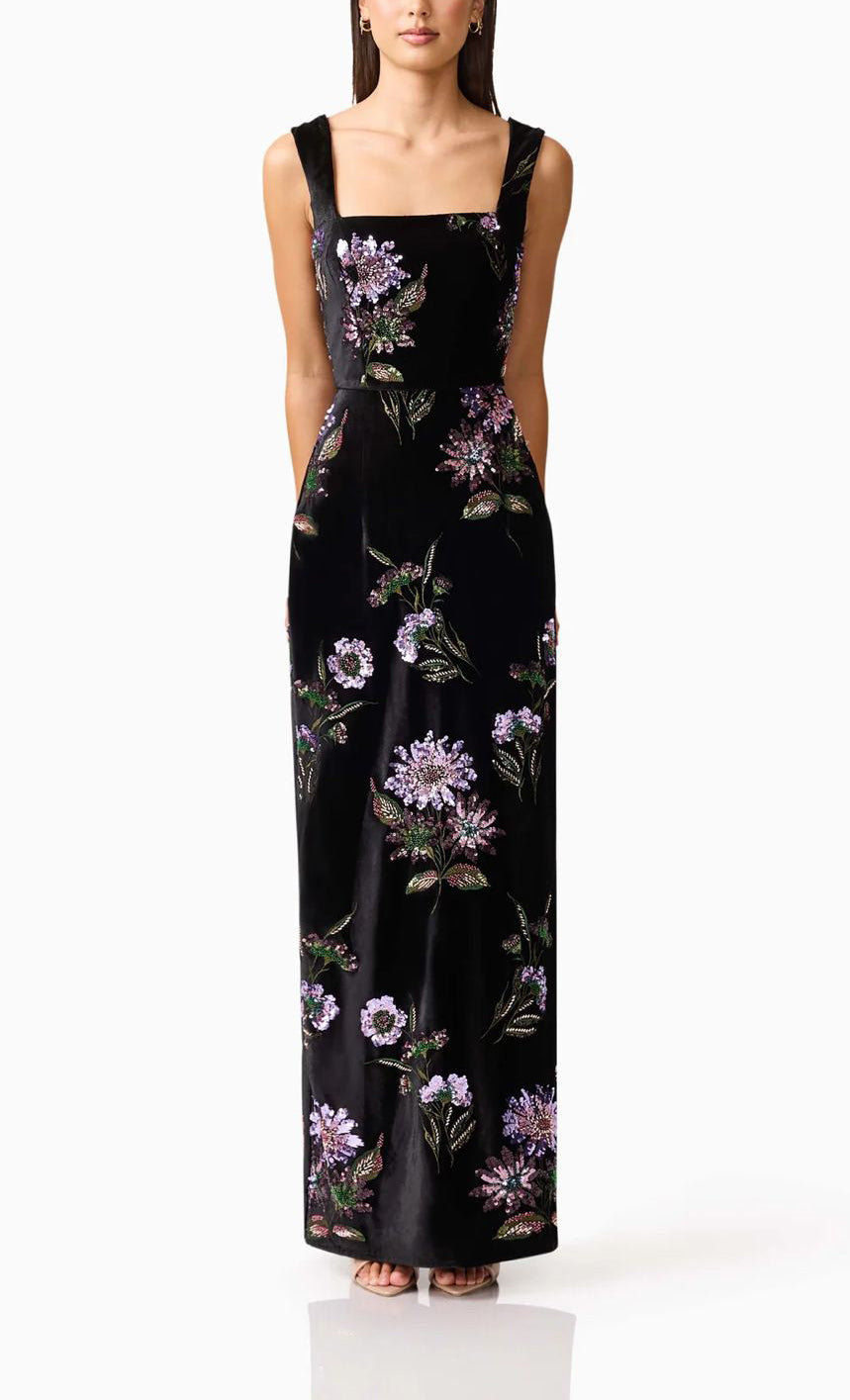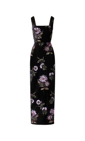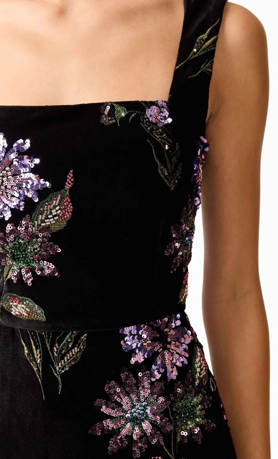 Vestido largo de terciopelo con bordado de lentejuela, tirantes gruesos ajustables, escote cuadrado, corte al cuerpo, abertura posterior y cierre metálico.