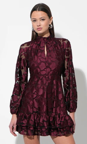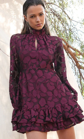 Vestido mini de tela texturizada de gasa con detalles de satín, cuello alto, manga larga abullonada, ajustado a la cintura, falda en corte A con olanes, movimiento y cierre invisible.