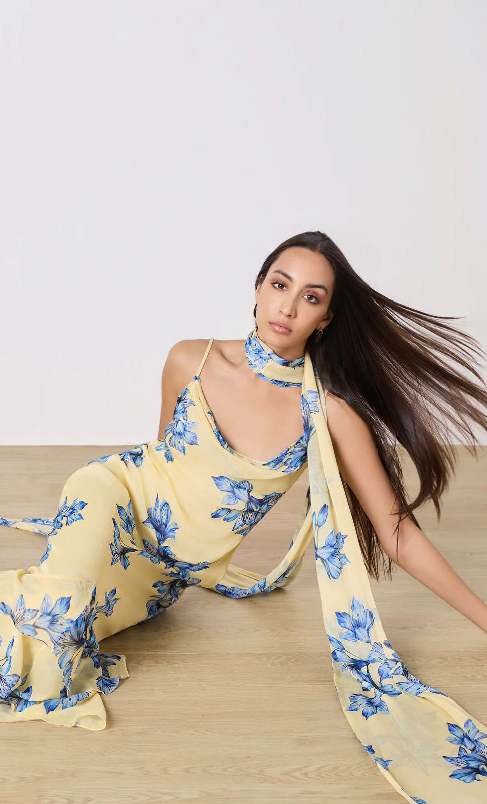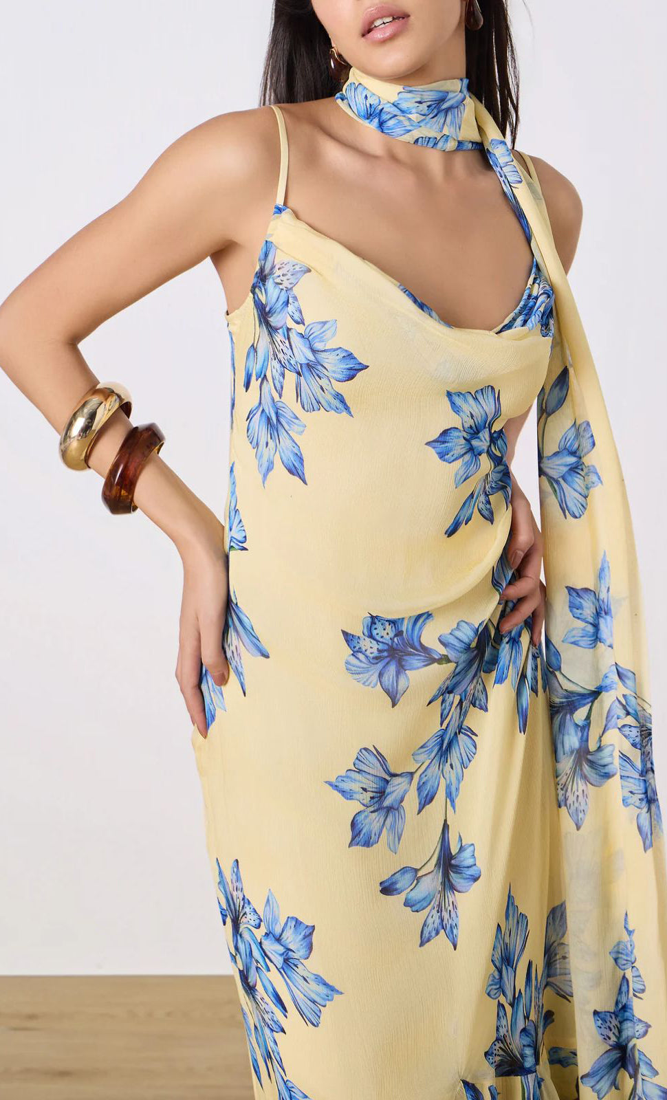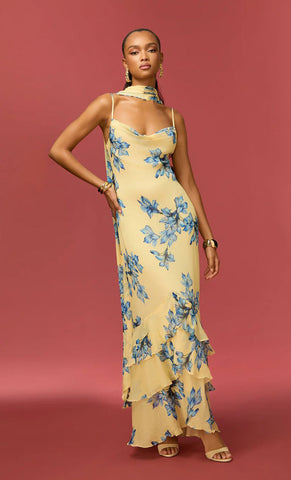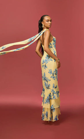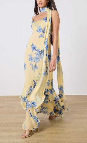 Vestido largo de gasa con print, escote tipo cowl, tirantes delgados, bufanda, corte al cuerpo, detalle de olanes en falda, movimiento y cierre invisible.