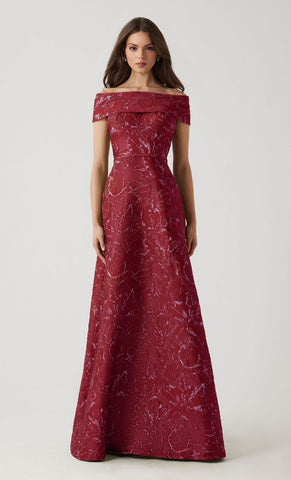 Vestido largo de tela brocada, off the shoulder, ajustado a al cintura, falda en corte A con movimiento y cierre invisible.