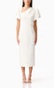 Vestido midi de stretch crepe, manga corta abullonada, detalle de pliegues en hombro, corte al cuerpo, abertura posterior y cierre invisible.