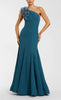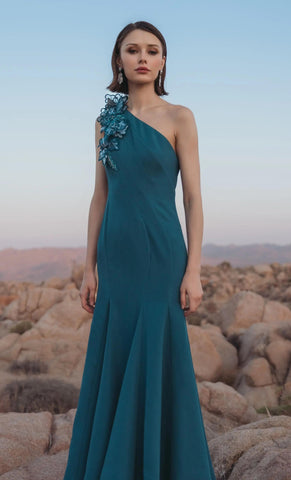 Vestido largo de stretch crepe, un hombro con detalle de flores en 3D y canutillo bordado, corte al cuerpo, falda con volumen, movimiento y cierre invisible.