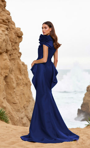 Vestido largo de tafeta, un hombro con detalle de olanes, peplum con cauda, corte al cuerpo y cierre invisible.