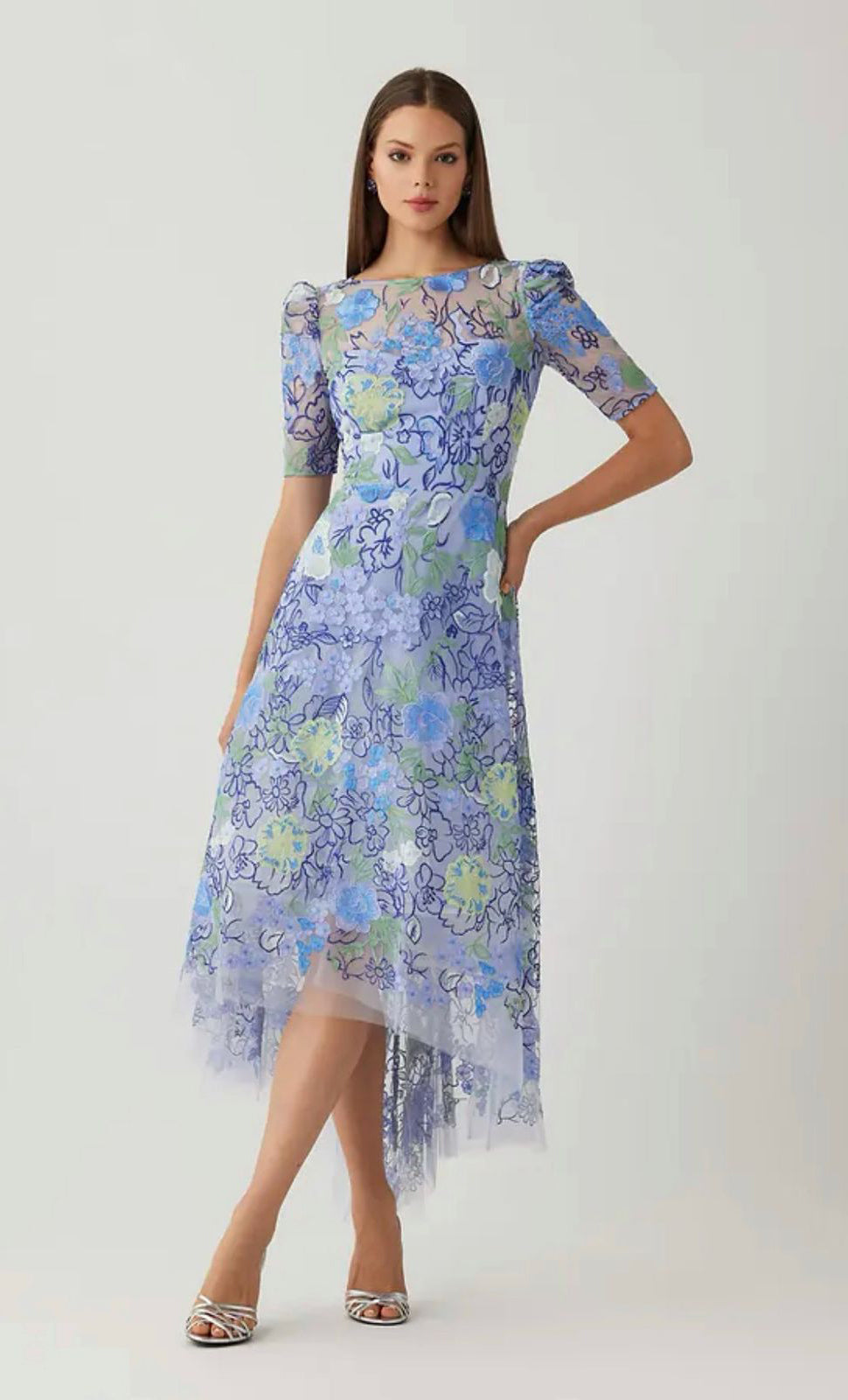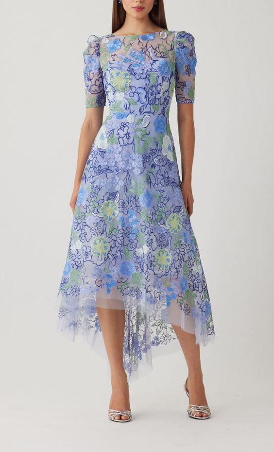 Vestido midi de tul completamente bordado, manga corta, ajustado a la cintura, falda high-low el corte A con movimiento y cierre invisible.