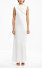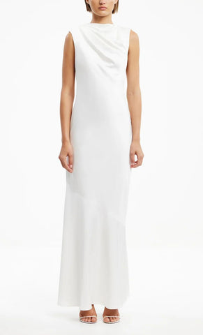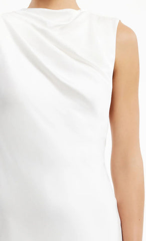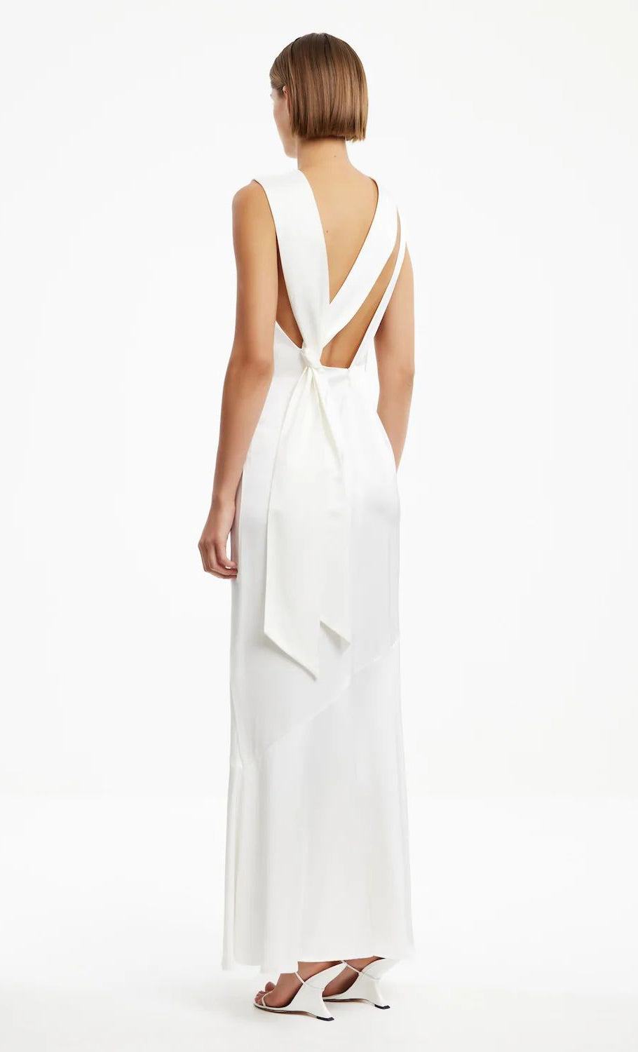 Vestido midi de satín, cuello tipo cowl, detalle de escote en espalda con tiras ajustables, corte al cuerpo, movimiento y cierre invisible.