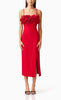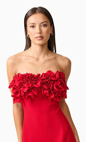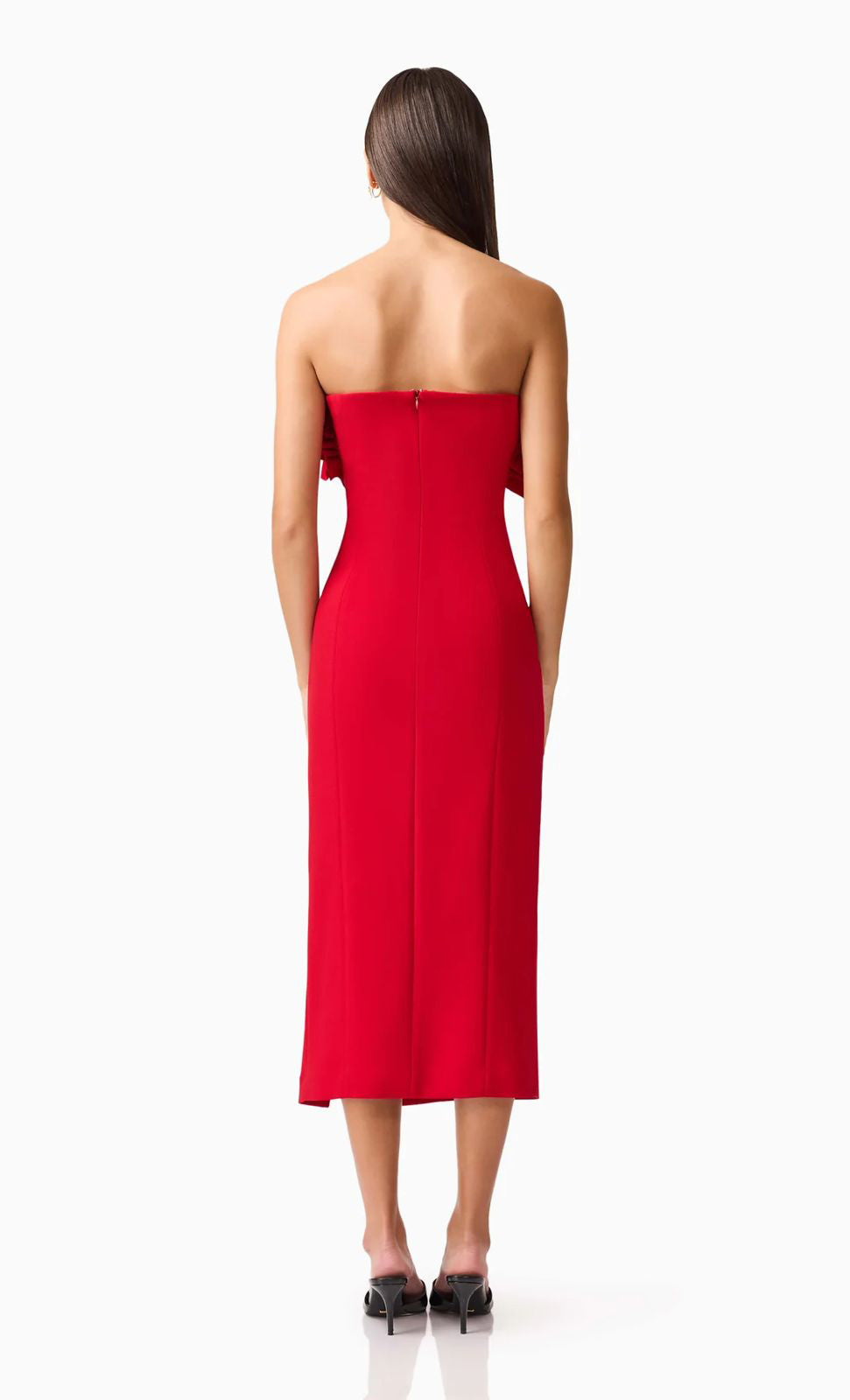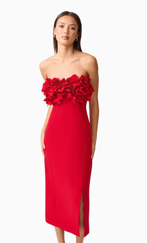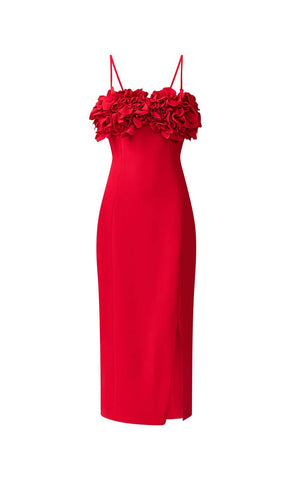 Vestido midi de stretch crepe, flores en 3D en parte superior, tirantes delgados, corte al cuerpo, abertura lateral y cierre invisible.