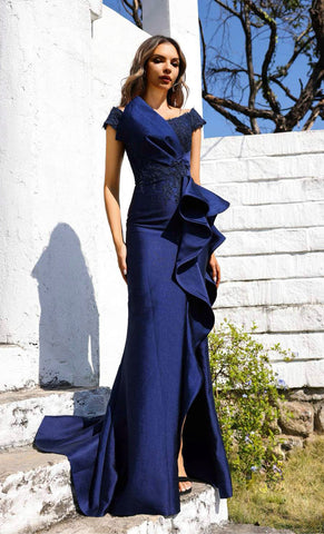 Vestido largo de tafeta con bordado, manga off the shoulder, detalle de olán en falda, corte al cuerpo, abertura, cauda y cierre invisible.