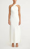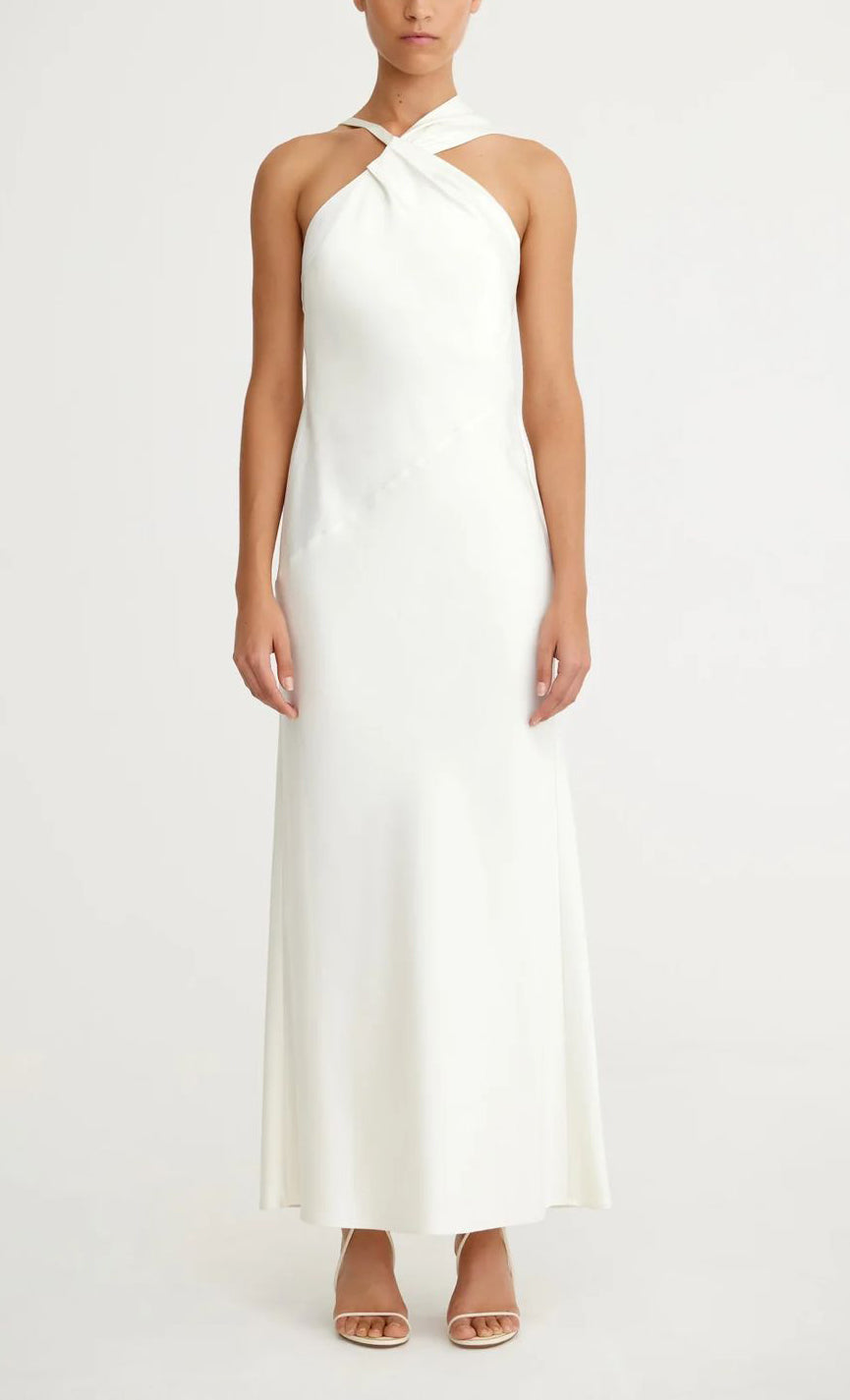 Vestido midi de satín, cuello halter asimétrico, escote en espalda con tiras ajustables, corte al cuerpo, movimiento y cierre invisible.