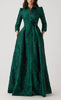 Vestido largo tipo camisero, tela brocada con detalles metálicos, manga 3/4, cinturón ajustable, falda en corte A con movimiento y botones al frente.