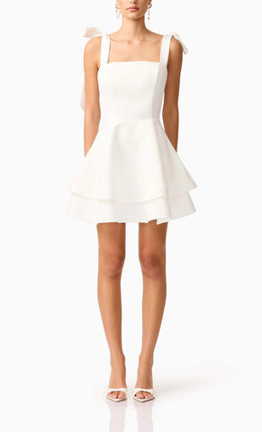 Vestido mini de stretch crepe, escote cuadrado, tirantes gruesos con detalle de moños, ajustado a la cintura, falda en corte a con movimiento y cierre invisible.